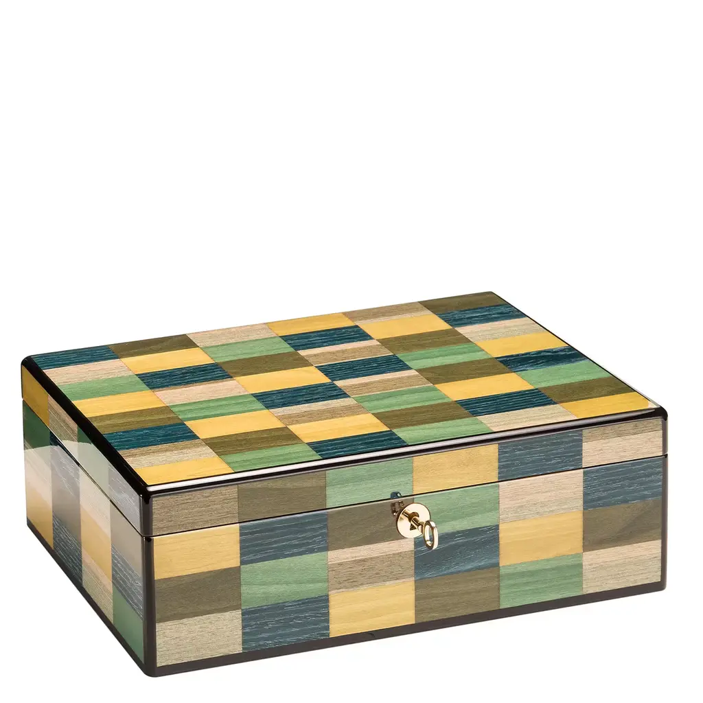 An elegant and refined design, this jewelry box will make a sophisticated accent on any classic or modern vanity. Crafted of mahogany wood enriched with gold-finished metal details, the box boasts a handmade veneered inlay of earth-toned rectangles, complementing the beige Alantara fabric. It features a ring holder, an open compartment, and two watch holders.