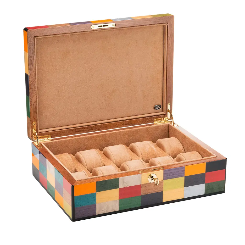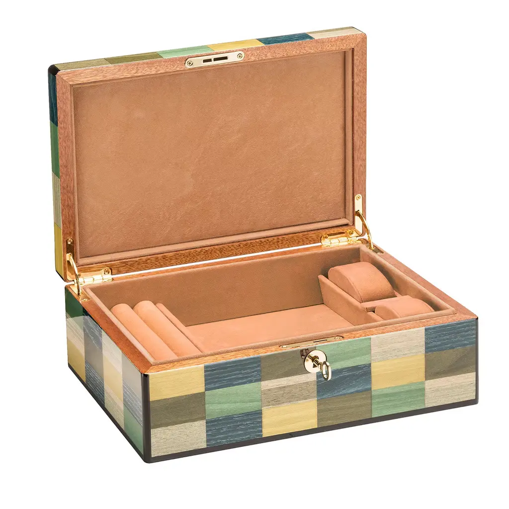 Exuding a refined allure combined with its modern geometric design, this jewelry box will make a lively addition to any style of decor. Fashioned of mahogany wood, it boasts a colorful handmade veneered inlay work contrasting the delicate beige hue of the lining. It features two removable trays placed above a similarly ample tray.
