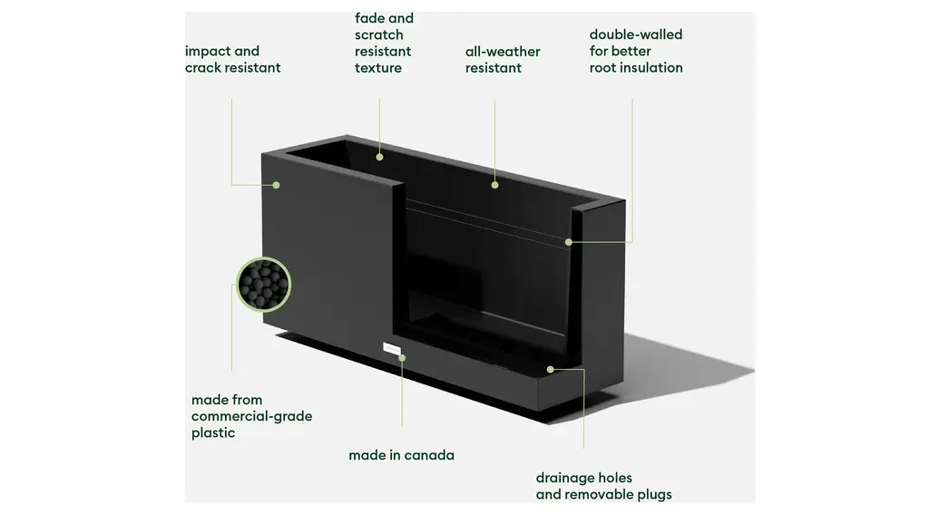 Low and long, the Veradek Long Box planter will add definition to outdoor spaces like the patio, balcony or garden. Complemented by its modern appearance, the Long Box is thoughtfully curated with functionality in mind—a double-walled design insulates your favorite plants and minimizes soil use while pre-drilled drainage holes help prevent overwatering. This sturdy yet lightweight rectangular planter is proudly crafted in Canada from high-grade recycled plastic, making it resistant to cracks, fading and UV and allowing it to withstand extreme temperatures ranging from -20 to +120 degrees. With the perfect balance of design, structure and purpose, the Long Box will add the finishing touches needed to transform a house into a home.