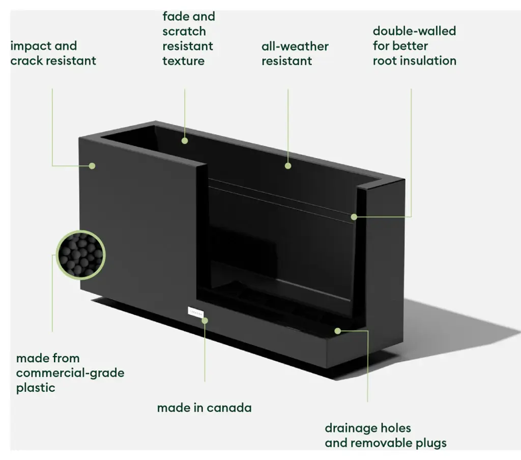 Low and long, the Veradek Long Box planter will add definition to outdoor spaces like the patio, balcony or garden. Complemented by its modern appearance, the Long Box is thoughtfully curated with functionality in mind"”a double-walled design insulates your favorite plants and minimizes soil use while pre-drilled drainage holes help prevent overwatering. This sturdy yet lightweight rectangular planter is proudly crafted in Canada from high-grade recycled plastic, making it resistant to cracks, fading and UV and allowing it to withstand extreme temperatures ranging from -20 to +120 degrees. With the perfect balance of design, structure and purpose, the Long Box will add the finishing touches needed to transform a house into a home.