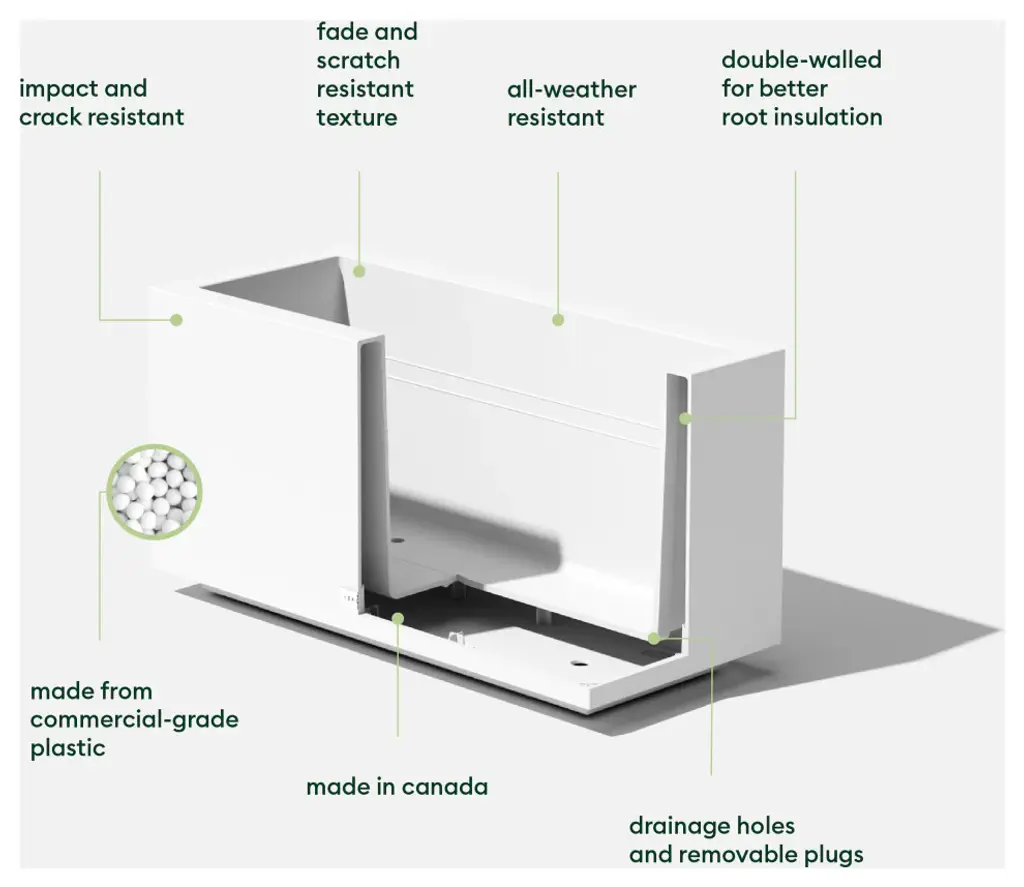 Low and long, the Veradek Long Box planter will add definition to outdoor spaces like the patio, balcony or garden. Complemented by its modern appearance, the Long Box is thoughtfully curated with functionality in mind"”a double-walled design insulates your favorite plants and minimizes soil use while pre-drilled drainage holes help prevent overwatering. This sturdy yet lightweight rectangular planter is proudly crafted in Canada from high-grade recycled plastic, making it resistant to cracks, fading and UV and allowing it to withstand extreme temperatures ranging from -20 to +120 degrees. With the perfect balance of design, structure and purpose, the Long Box will add the finishing touches needed to transform a house into a home.
