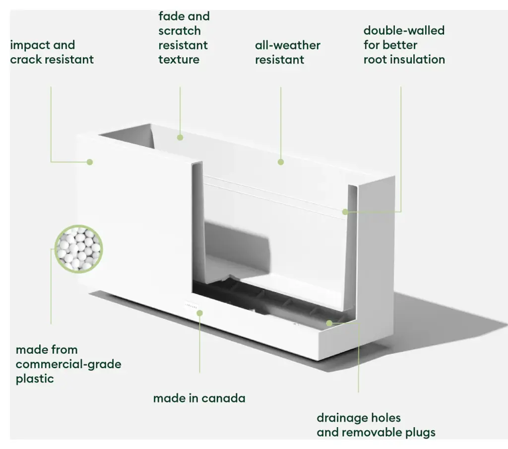Low and long, the Veradek Long Box planter will add definition to outdoor spaces like the patio, balcony or garden. Complemented by its modern appearance, the Long Box is thoughtfully curated with functionality in mind"”a double-walled design insulates your favorite plants and minimizes soil use while pre-drilled drainage holes help prevent overwatering. This sturdy yet lightweight rectangular planter is proudly crafted in Canada from high-grade recycled plastic, making it resistant to cracks, fading and UV and allowing it to withstand extreme temperatures ranging from -20 to +120 degrees. With the perfect balance of design, structure and purpose, the Long Box will add the finishing touches needed to transform a house into a home.