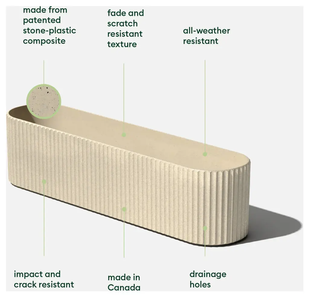 Proudly display your favorite blooms this season with the Veradek Demi Series Window Box planter. Inspired by Roman columns, its softened lines and fluted details add a subtle hint of texture to the windowsill or balcony. This sturdy yet lightweight planter is crafted from a patented plastic-stone composite, making it resistant to cracks, fading and UV damage allowing it to withstand extreme temperatures ranging from -20 to +120 degrees. Veradek planters are proudly designed and made in Canada, so you can rest assured that your products are made to last. With a combination of contemporary design and quality materials, the Demi Window Box adds the finishing touches to any space, inside or out.