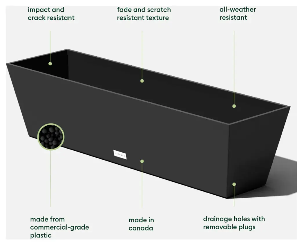 A fresh take on a classic concept; the Veradek Window Box Planter adds character to windowsills, balconies or tabletops. Complemented by its modern appearance, the Window Box is thoughtfully curated with versatility in mind"”pre-drilled drainage holes allow you to plant a variety of different greenery such as flowers, succulents or herbs without having to worry about overwatering. This sturdy yet lightweight rectangular planter is proudly crafted in Canada from high-grade recycled plastic, making it resistant to cracks, fading and UV and allowing it to withstand extreme temperatures ranging from -20 to +120 degrees. With the ideal balance of design, structure and purpose, the Window Box will add the final touches to any outdoor space.