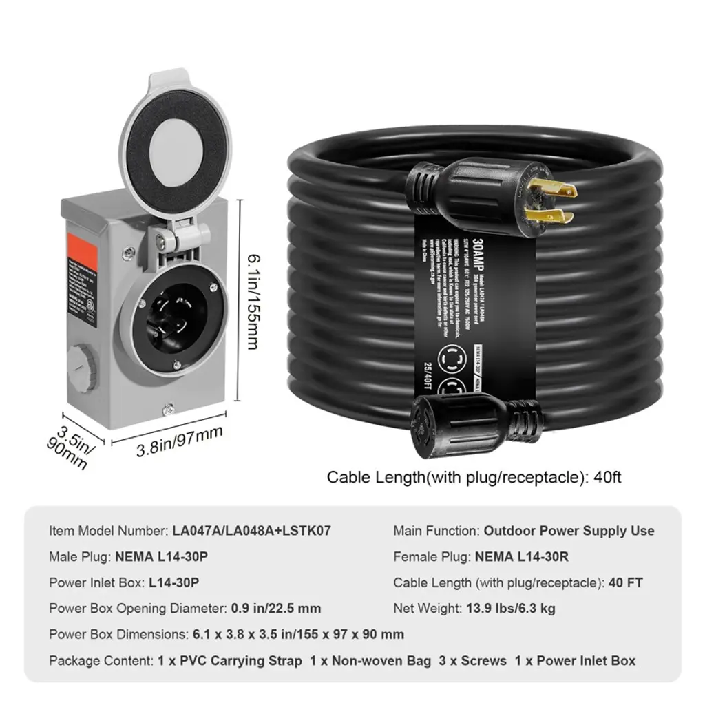 Feature: Premium 30A Generator Cord: Our generator cord is STW gauge with a 4 x 10AWG wire, supporting up to 30 AMP current. Featuring a NEMA L14-30P male plug designed to fit into a 30A generator output and a twist-lock NEMA L14-30R female plug for a secure connection to a 30A power inlet box with a NEMA L14-30P male end. Perfect for emergency power needs in any weather! ETL Certified Reliability: Ensure ultimate security and durability with our ETL-certified generator cord and power inlet box, designed to withstand tough conditions. This 40-foot heavy-duty generator cord is crafted from pure copper wiring and encased in flame-retardant PVC that resists heat and UV damage. It protects against rain, wind, snow, soil, and rocks, even when used outdoors for long periods. Flip Cover Power Inlet Box: Featuring a pre-drilled hole design with detachable plug, this power inlet box simplifies installation without additional tools. Its entire casing is coated with a rust-resistant layer, providing robust protection against wind, rain, and dust. The clear indicator light on the flip cover illuminates when the power is successfully connected, allowing for easy visibility at any time of day or night. Self-Locking Design: The generator cord is designed with self-locking male and female plugs, allowing for easy connection while significantly reducing the damage from forceful plugging or unplugging. Once the plug is inserted and twisted to lock, it ensures a tight and stable connection that won’t accidentally dislodge from the socket, protecting against dust and water intrusion. Enjoy peace of mind with every connection. Ideal for Outdoor Power Needs: Experience uninterrupted power supply to your home or RV with our 30A generator cord and power inlet box kit, even during power outages and severe weather conditions. It includes a carrying strap and a storage bag, making it easy to handle and store. When not in use, the generator cord can be easily rolled up and stored without taking up space in your RV or home. Rely on our kit for a stable and dependable power output! Package Content 1 x PVC Carrying Strap 1 x Non-woven Bag 3 x Screws 1 x Power Inlet Box