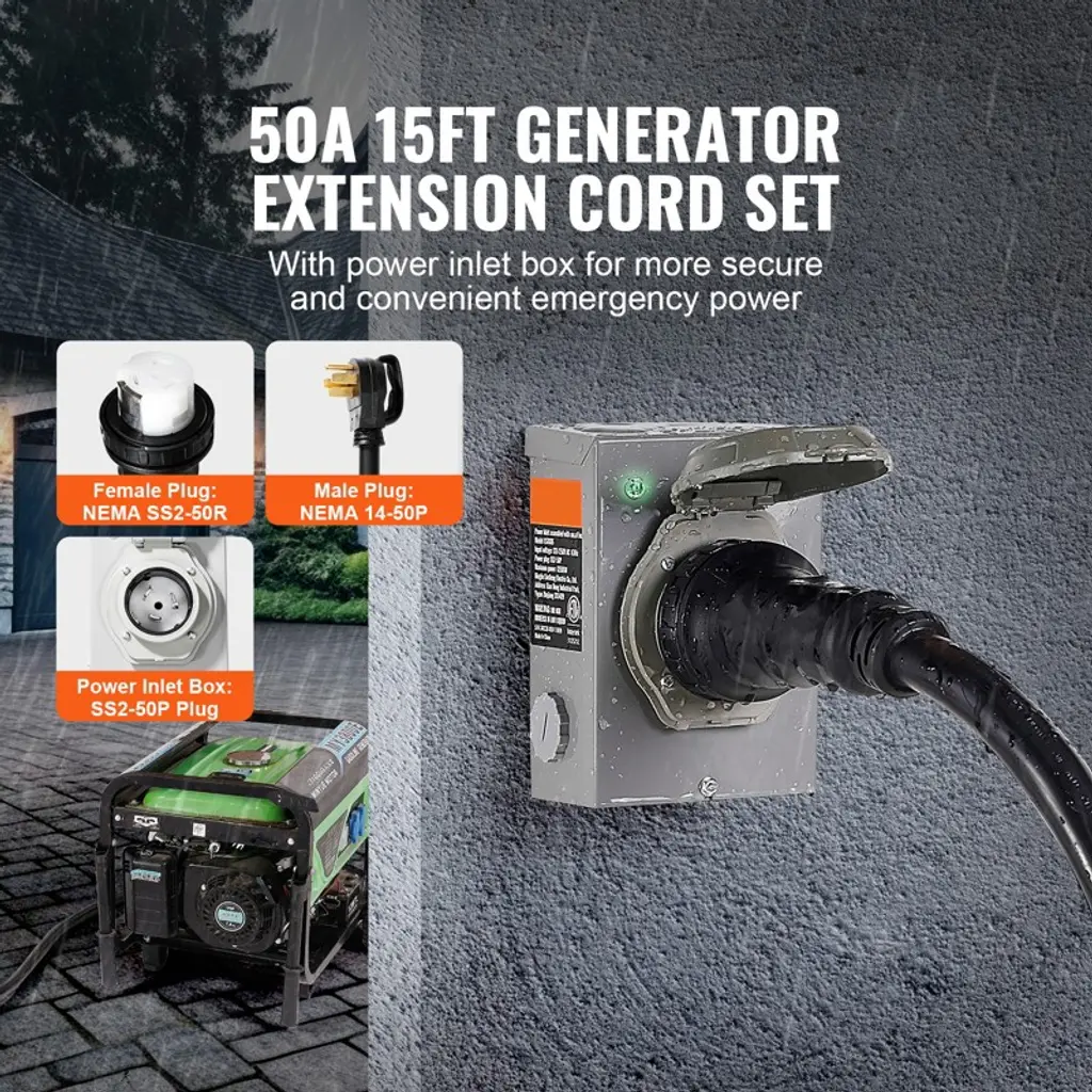 Vevor 50 Amp Generator Cord And Power Inlet Box Kit, 15ft, Nema 14-50p/ss2-50r Stw 6/3+8/1 Awg Generator Power Cord With Twist Lock Connector, Black