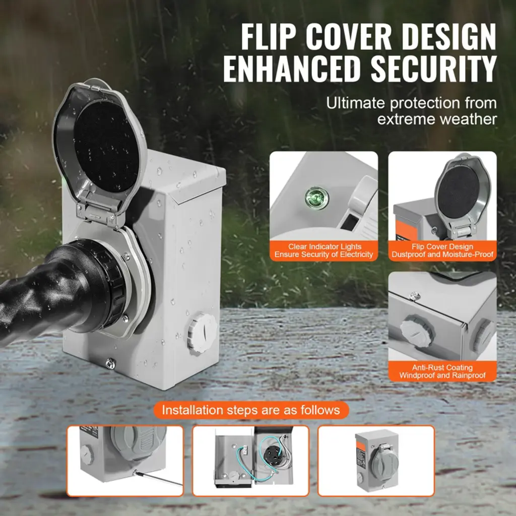 Feature: Premium 50A Generator Cord: Our generator cord is STW gauge with 6/3+8/1 AWG Cord, supporting up to 50 AMP current. Featuring a NEMA 14-50P male plug designed to fit into a 50A generator output and a twist-lock NEMA SS2-50R female plug for a secure connection to a 50A power inlet box with a NEMA SS2-50P male end. Perfect for emergency power needs in any weather! ETL Certified Reliability: Ensure ultimate security and durability with our ETL-certified generator cord and power inlet box, designed to withstand tough conditions. This 50-foot heavy-duty generator cord is crafted from pure copper wiring and encased in flame-retardant PVC that resists heat and UV damage. It protects against rain, wind, snow, soil, and rocks, even when used outdoors for long periods. Flip Cover Power Inlet Box: Featuring a pre-drilled hole design with detachable plug, this power inlet box simplifies installation without additional tools. Its entire casing is coated with a rust-resistant layer, providing robust protection against wind, rain, and dust. The clear indicator light on the flip cover illuminates when the power is successfully connected, allowing for easy visibility at any time of day or night. Twist-Lock Design: Our generator cord features a thoughtfully designed handle on the male plug, making it effortless to connect and disconnect while reducing the risk of damage from forceful interactions. The female end boasts a robust twist-lock mechanism that securely locks the plug into place with a simple twist. It ensures a stable, slip-free connection and shields the interior from dust and water intrusion. Ideal for Outdoor Power Needs: Experience uninterrupted power supply to your home or RV with our 50A generator cord and power inlet box kit, even during power outages and severe weather conditions. It includes a carrying strap and a storage bag, making it easy to handle and store. When not in use, the generator cord can be easily rolled up and stored without taking up space in your RV or home. Rely on our kit for a stable and dependable power output! Package Content 1 x PVC Carrying Strap 1 x Non-woven Bag 3 x Screws 1 x Power Inlet Box