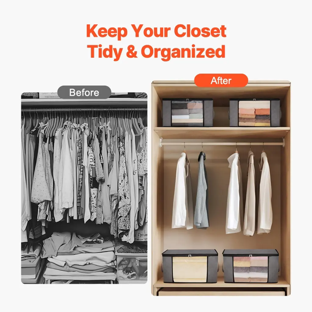 Feature: 6-Piece Large Capacity Blanket Storage Bags: Each bag measures 21.7x13x12.2 inch. The 60L capacity clothes storage bags are erfect for organizing bedding, seasonal clothes, toys, and more. The bags are foldable for easy storage, saving valuable space. High-Quality Materials: These large storage bags are made with a 3-layer thick non-woven fabric that is durable, tear-resistant, and breathable. The material provides excellent protection for your clothes, keeping them clean and fresh even when stored for a season. Easy to Identify: The foldable closet organizers storage containers feature a large transparent window for a clear view, allowing you to quickly identify contents without opening the bag. This makes it easy to find and store items daily. Convenient Features: The thick fabric blanket storage bags come with sturdy handles on both sides for easy transport and long-lasting durability. The dual metal zippers provide a secure seal while ensuring smooth opening and closing, making storage effortless and efficient. Versatile Use: These blanket storage bags are perfect for daily home storage, as well as for moving or traveling. They help you organize your items efficiently, eliminate clutter, and restore order to your living space. Package Content: 6 x Storage Bags