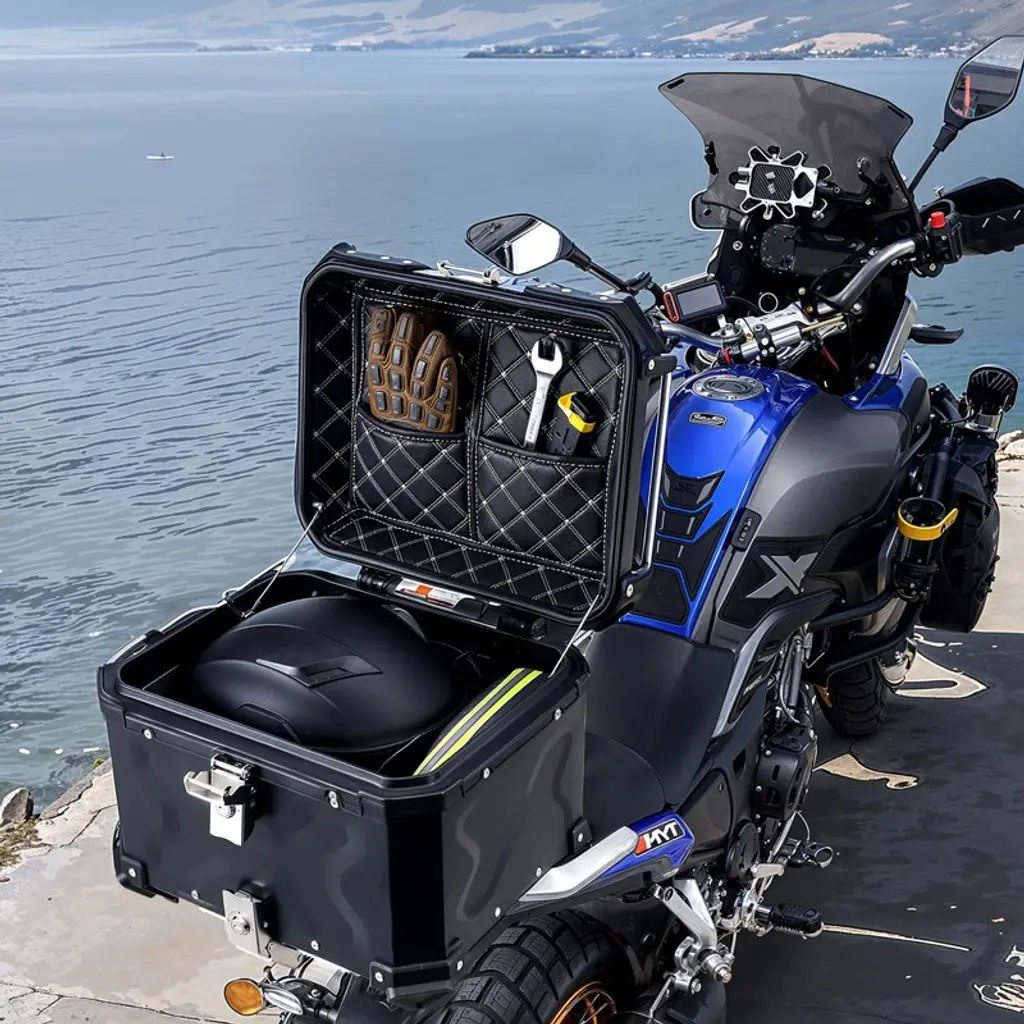 Feature: Heavy-Duty Premium Case: Our motorcycle storage box is built tough, made from 1.2 mm thick aluminum alloy that is wear & drop-resistant. Each corner is reinforced with bumpers, making it a suitable companion for your travels. Inside the box, the removable leather padding offers cushioning to guard your belongings, even under heavy impact. 45L Large Capacity: With a spacious 45L capacity, this motorcycle trunk features two small inner pockets, suitable for storing a large helmet, water bottle, umbrella, gloves, raincoat, daily shopping bags, or a small backpack. The included sturdy stainless steel security lock keeps your items secure from theft. Have a try on our large motorcycle trunk! Weatherproof & Durable: The sealed motorcycle trunk is designed to withstand various weather conditions, providing premium waterproof and dustproof guard. Whether you're caught in heavy rain or dusty weather, your items will stay dry and secure inside. This trunk is built to endure harsh environment, keeping your belongings guarded throughout your journey. Versatil & Compatible: The bottom of the trunk features a base with 25 mounting holes, making it compatible with a wide range of motorcycles, including Harley, Yamaha, Touring models, and standard motorcycles. Simply align the base with your tail rack for easy installation—no drilling required. Say goodbye to hard installation! Comfort & Secure: The thick, comfortable back cushion provides lumbar support for you or your passenger, offering a safer and more secure ride during acceleration. Additionally, two types of reflective stickers are included to enhance visibility, adding a stylish touch while improving safety when navigating intersections or making turns. Package Content: 1 x Installation tool kit 2 x Reflective Sticer 2 x Keys 1 x Mounting Bracket Base Plate (already installed on the box) 1 x Upper Backrest Base 1 x Lower Backrest Base 2 x Cleaning Cotton 1 x User manual