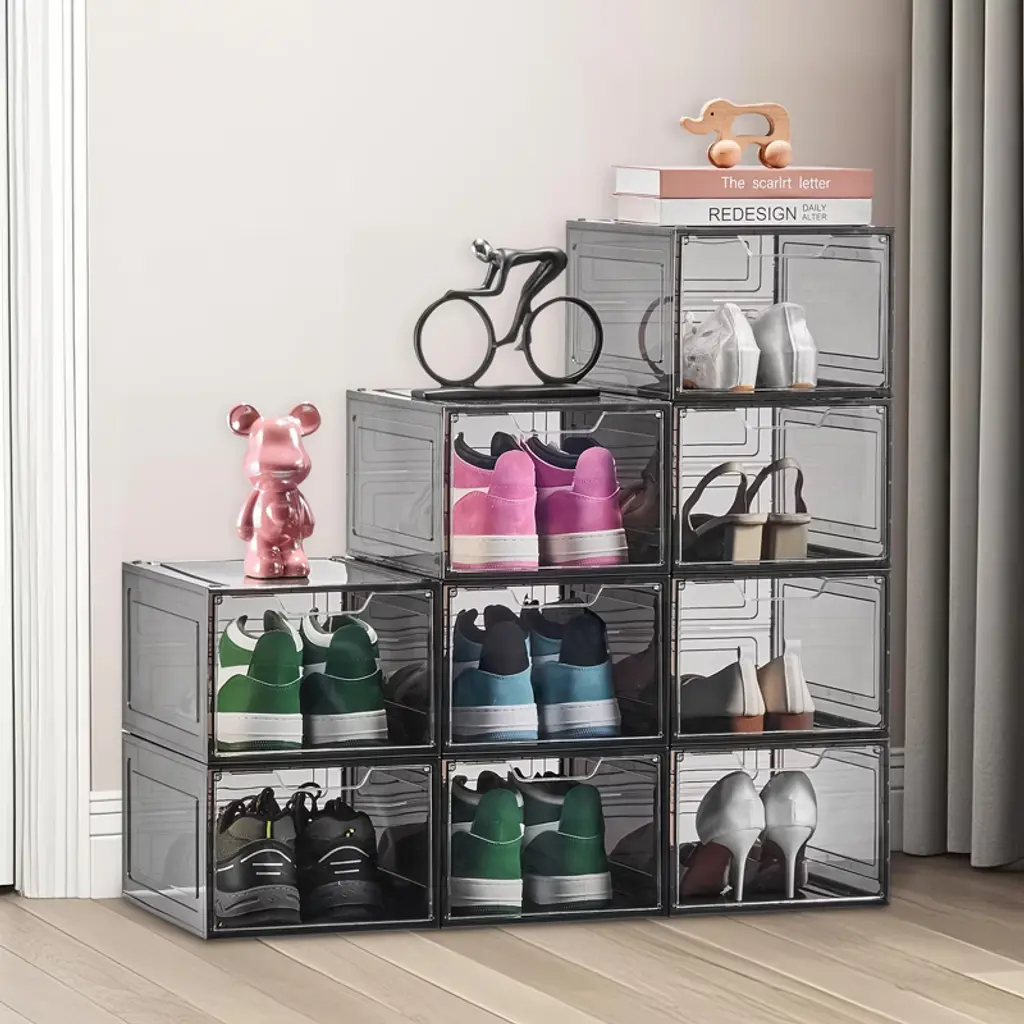 Feature: Sturdy Thickened Construction: Our shoe storage boxes are made of upgraded PP/PET on all six sides, providing superior strength for stacking multiple boxes without warping or cracking. The magnetic front door design makes it easy to access your shoes. Stackable Design: Top and bottom non-slip features allow for stable stacking, making clear shoe boxes easy to organize in any corner of your home. The reinforced material supports more boxes, helping you store more shoes and keep your space tidy. Spacious and Versatile: Generous size (13.39 x 9.8 x 7.2 in) fits a wide range of shoe types and sizes. Our stackable shoe boxes are also ideal for hats, clothing, small items, toys, and more. The clear design allows you to quickly find what you need. Water-Proof and Dust-Proof: High protection level keeps water splashes and dust out. Made from easy-to-clean plastic – just wipe to restore the clear surface. Our shoe organizer boxes provide superior durability for your favorite items. Quick, Tool-Free Assembly: No complicated setup – just 5 easy steps to assemble. The plastic shoe organizer fits up to US Size 13 shoes. The transparent body and front door make it simple to spot your shoes, keeping your space neat and organized. Package Content: 9 x Shoe Boxes