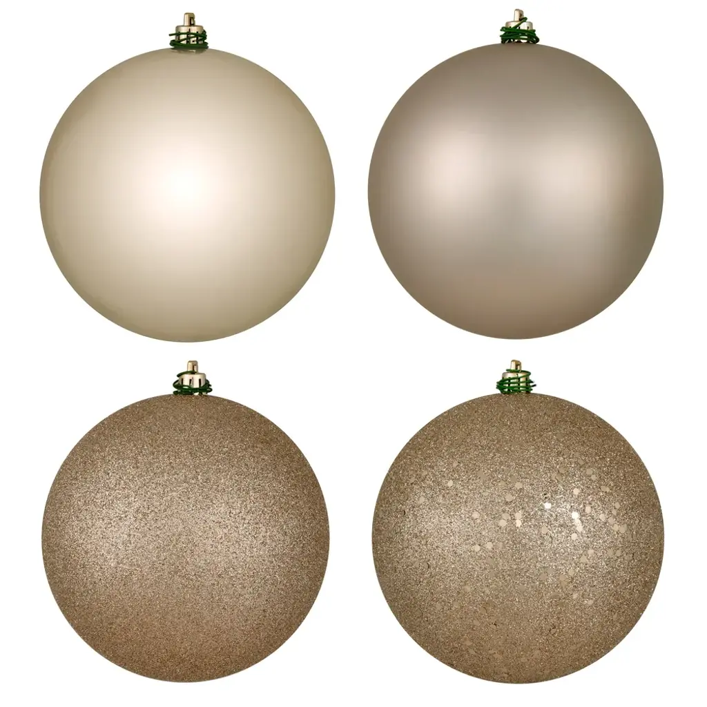 Vickerman 6" Oat 4-Finish Ball Ornament Set. This set includes matte, shiny, glitter, and sequin finished ornaments for a touch of variety to any holiday decorating project. These ornaments are made from shatterproof plastic for durability and reliable hanging. This assortment is an exceptional addition to any collection as it matches well with a variety of décor and goes perfectly on a holiday tree. Includes 4 ornaments per box.