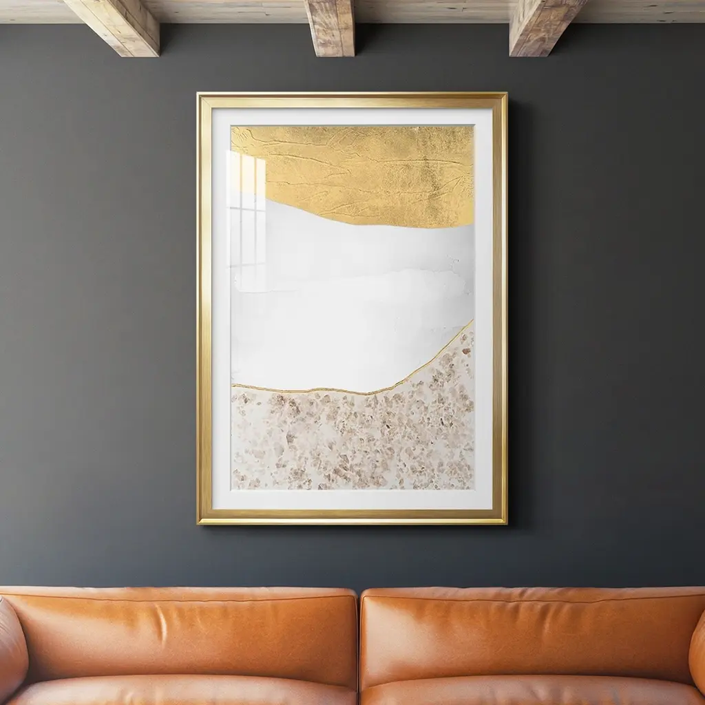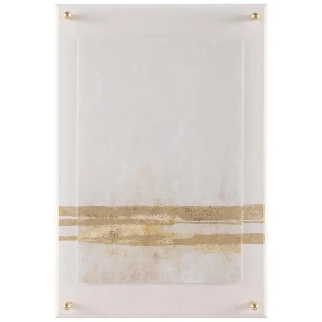 Ethereal Horizon by artist Victoria Barnes is a print on watercolor paper that brings refined texture and luminous tones to any space. Bold horizontal streaks of gold leaf anchor the lower edge, enhanced by a textured gloss gel that accentuates the contrast against the surrounding whites. Mounted to a hand-painted board and displayed beneath an acrylic sheet with brass standoffs, the piece achieves a sleek, contemporary look.