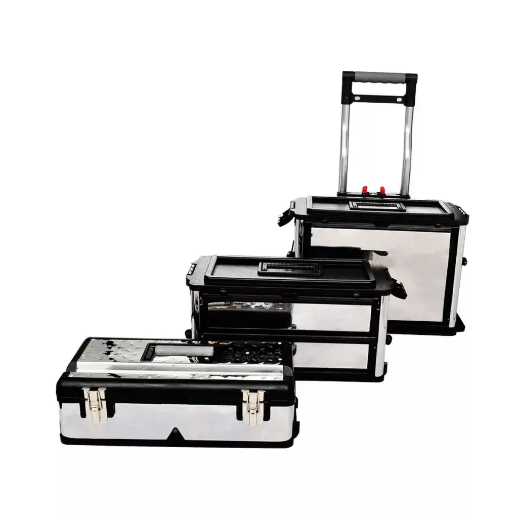 This tool box is a perfect setup for anyone who needs to travel with their tools frequently or as a highly-mobile, centralized place for hobby tools or arts crafts supplies. It contains 3 separable components: the traditional toolbox, the 2-drawer compartment, and the large bottom box.This handy toolbox features 2-drawer storage chest for holding small tools, parts and supplies. It also has a large, deep storage chest at the top and bottom each for bigger items.It rolls effortlessly on soft-rubber wheels. The heavy-gauge, non-corroding stainless steel and impact-resistant PP construction ensure a long service. The large pull-handle extends to 5.9".Warning: Cancer and Reproductive Harm----www.P65Warnings.ca.gov.