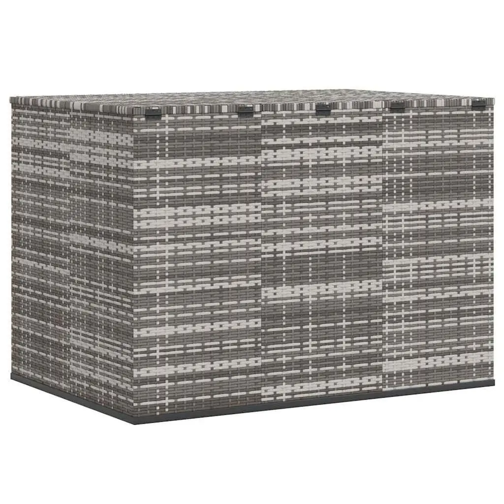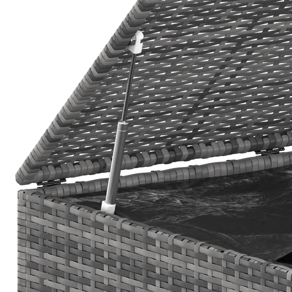This large garden cushion box combines modern design and practical function, providing a smart storage solution for both indoor and outdoor areas. Made from high-quality PE rattan and powder-coated steel, it looks good and is built to last, offering a secure and spacious space to neatly store cushions, pillows, and other outdoor essentials while keeping them safe from the elements. Ample Storage: This cushion box provides loads of room for storing cushions and pillows. Its size is perfect for keeping your outdoor area tidy and letting you grab things when you need them.Durable Design: Built tough, this box can take on the elements. The materials used guarantee it can handle everyday wear while looking smart and true to its function.Water-Resistant: With water-resistant features, this cushion box keeps your stored items safe from moisture and rain, ensuring your cushions stay dry and in tip-top shape.Stylish Appearance: With a chic textured gray finish and black accents, this cushion box looks fab in any patio, garden, or balcony, blending nicely with various outdoor furniture styles.Comfort in Use: Thanks to the gas lift mechanism, opening and closing this cushion box is a breeze. You can access your stored items easily without any fuss.