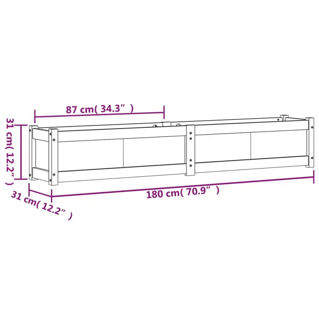 This large rectangular garden planter is a versatile and attractive choice for anyone looking to enhance their outdoor space with natural charm. Crafted from solid pine wood, it offers a rustic look that complements gardens, terraces, and balconies. The planter is available in multiple color finishes, including Brown pine, Natural douglas, Natural impregnated, Natural pine, and White pine, and can be purchased as a single unit or a set of two to suit your gardening needs.Key Features• Durable solid pine wood construction for long-lasting outdoor use• Spacious design with generous planting area for flowers, herbs, or vegetables• Rustic, natural wood finish to suit a variety of outdoor décor styles• Easy assembly with included instructions• Available in several color options and quantitiesDesign and Dimensions• Rectangular shape with framed slatted-panel design• Dimensions: Approximately 70.9 in (W) x 70.9 in (L) x 12.2 in (H) (varies slightly by variant)• Weight: Up to 62.28 lbs (varies by model)• Visible wood grain and knots for a natural lookOutdoor Use and Versatility• Designed specifically for outdoor spaces such as gardens, patios, and terraces• Drainage features included on select models to help maintain healthy plants• Plenty of room for growing a variety of plants, from flowers to vegetables and herbsAssembly and Care• Assembly required; clear instructions provided• For best results, use a waterproof cover when not in use to maintain appearanceAvailable Options• Colors: Brown pine, Natural douglas, Natural impregnated, Natural pine, White pine• Quantities: Single planter or set of 2SKU: 837494 (see product options for additional SKUs and details)