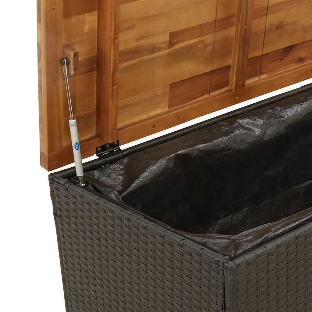 This outdoor storage box mixes practicality with a modern look, making it a fab addition to your garden or patio. Its sleek black and brown finish, along with a sturdy design, means it’s great for holding cushions, blankets, and garden tools, while also doubling up as a comfy seat for your outdoor hangs. This storage box has loads of space perfect for cushions, blankets, and gardening tools, keeping everything neat and easy to grab all year round. Made from tough materials, it has solid acacia wood and a strong poly rattan design, ensuring it lasts through all sorts of weather. Weather-proof and UV-protected, you can count on your items staying dry and shielded from the sun, making it good for both indoor and outdoor use. The smooth finish and modern look allow it to fit right in with any patio furniture, giving you a stylish and functional solution for outdoor storage. Its handy shape and size make it perfect for balconies, gardens, and garages, providing storage and a comfy seat when you need it.