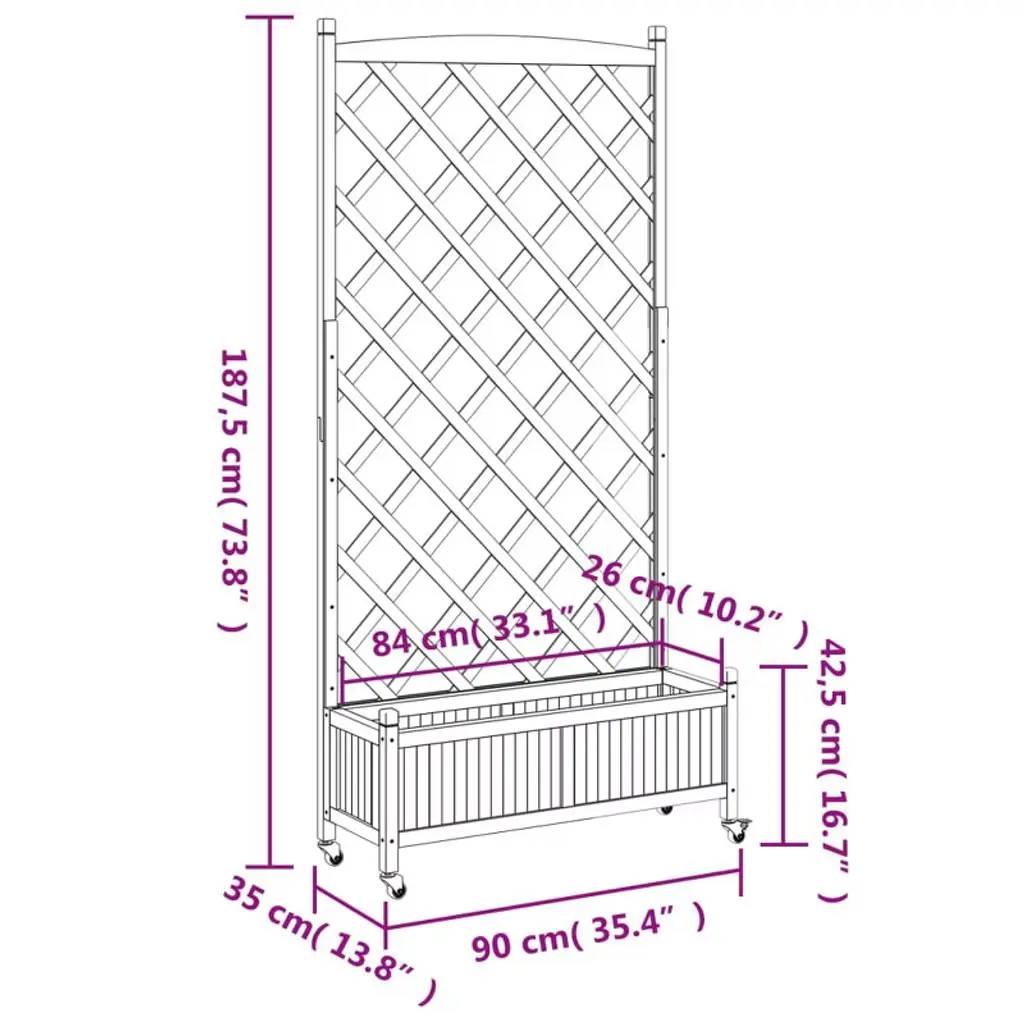 This awesome planter with trellis and wheels is perfect for showcasing your favorite climbing plants, flowers, and veggies, whether outdoors or indoors. Made from solid fir wood, its rustic brown finish really highlights its traditional style and looks amazing on any balcony or patio.Specifications:Color: Brown Shape: RectangularFinish: Matte Indoor/Outdoor: Indoor / OutdoorRoom: BalconyDimensions: 13.8 x 35.4 x 73.8 in (W x L x H)Wheel Diameter: 1.4 inDrainage: YesBrand: vidaXLDelivery Contains: 1 x PlanterAssembly Required: YesRecommended Number of People for Assembly: 2SKU: 3207653EAN: 8721012261945