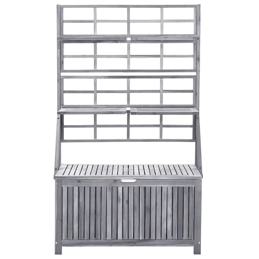 This rustic trellis storage box is perfect for boosting your outdoor space while providing loads of storage. Made from solid acacia wood with a lovely gray wash finish, it matches your balcony or garden decor and gives you a handy spot for cushions or garden tools, while also supporting climbing plants with the trellis. Stylish nature-inspired design enhances any outdoor setupDurable solid acacia construction guarantees long-lasting performanceFour adjustable shelves let you organize your stuff just how you likeWater-resistant features keep everything safe from the elementsIdeal for storing cushions, blankets, and even plants in the garden