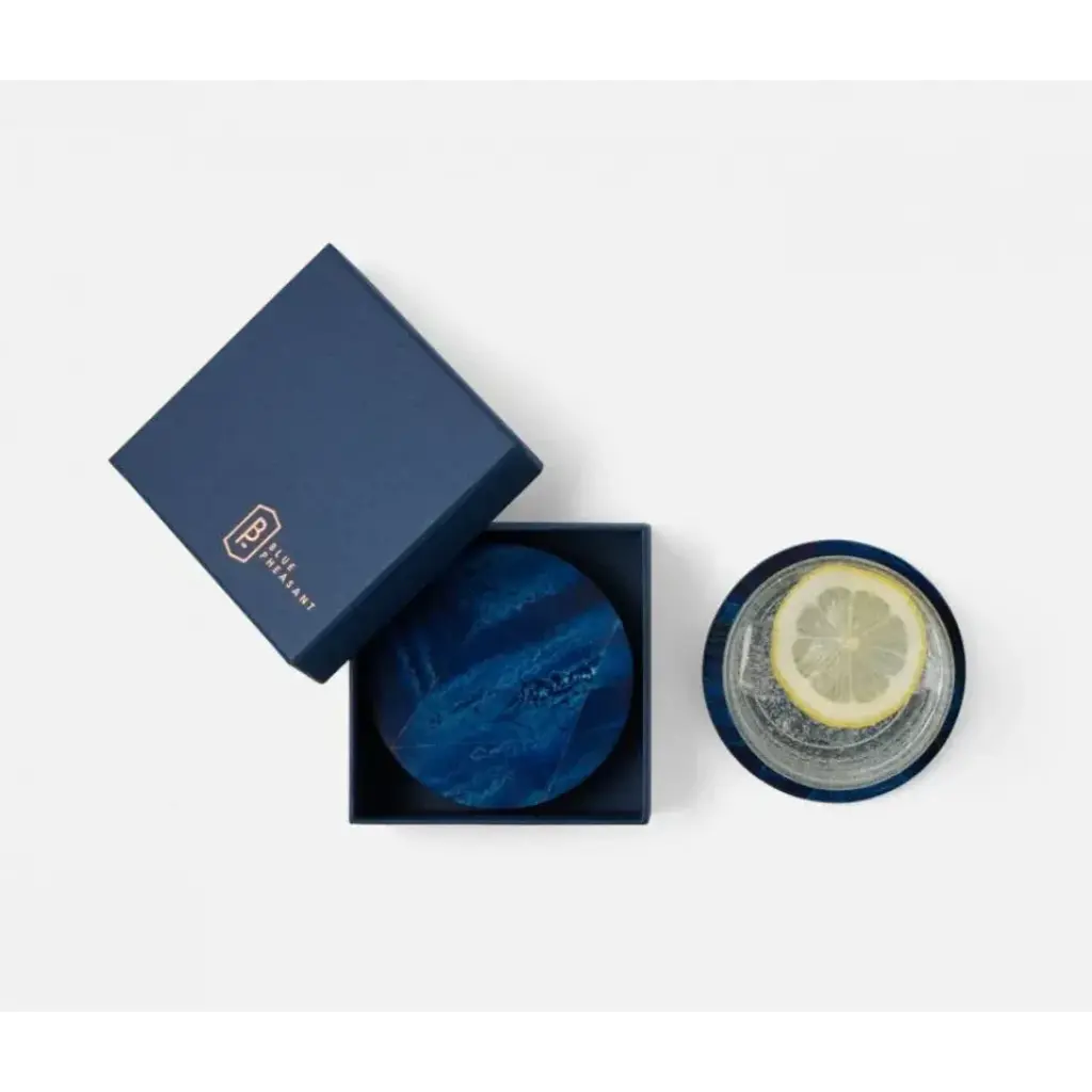 Finish: Blue Material: Marbled Resin This moody, masculine coaster set is made from wedges of marbled resin with striations that create sharp, angular patterns. Blue Pheasant's products are handmade with care by artisans using natural materials. They are not mass produced, so variation between products should be expected, and this is why we love them! It is these irregularities that makes Blue Pheasant what it is—a special brand whose collections are distinctly handmade, full of charm and originality you’ll never find in machine-made products.