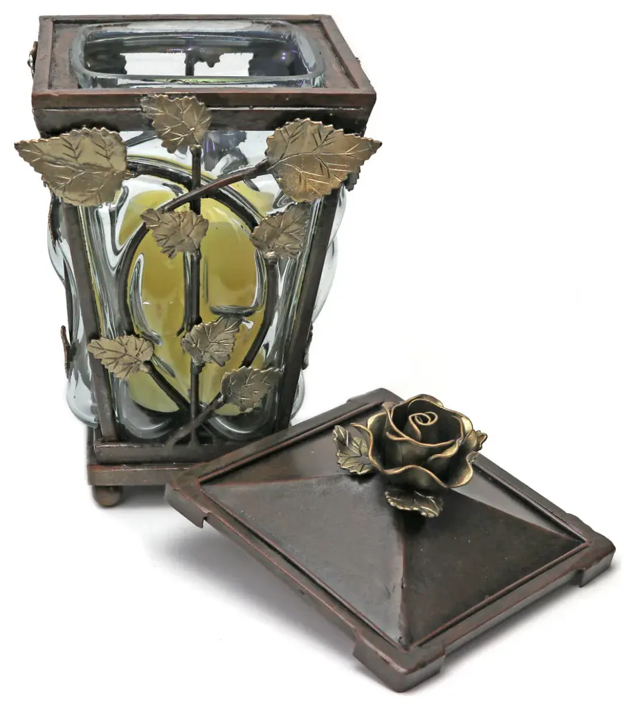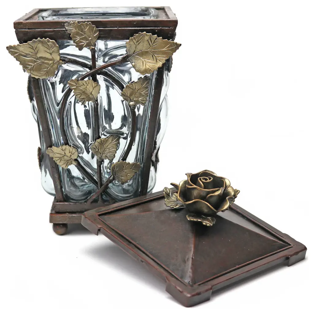 Vine Wrought Iron Canister. This carefully tailor-made canister in wrought iron and recycled glass accommodates both functionality and design. Since 1986, Janice Minor the designer, has pioneered the use of mixed media, recycled glass, wrought iron and rattan to create sophisticated and unique home decor pieces that are of world class quality. Janice Minor is the name for exquisiteness, creativity, and functionality. The Vine Canister 11.5" Ht. and 6" Square will add a beautiful touch of elegance to any home or office. This decorative object and also be used as a candle holder when the cover is removed. As each item is individually handcrafted, no two pieces are exactly alike with slight variations in size and color. Made in the Philippines.Vine Wrought Iron Canister 11.5" Ht. 6" SquareMade of wrought iron and recycled glassMade in the PhilippinesAs each item is individually crafted there may be slight variations in size and color