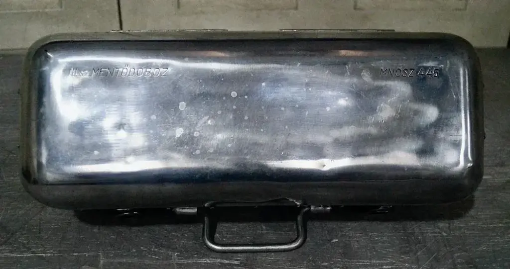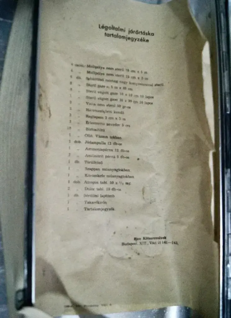 Vintage first aid military case from Hungary, complete with the original contents paper describing which items would have been included. C1940 This is a great-looking aluminium first aid box, originally used on military trucks. It is in wonderful condition with minimal traces of usage, has been polishes to showcase the original metal. A lovely vintage item that can be a lovely addition to a collection, a beautiful vintage decorative item, or even can be used as a first aid box, or as a fishing tackle box. The box is a genuine piece with great quality and is made to last. (3 available) This piece has an attribution mark, I am sure that it is completely authentic and take full responsibility for any authenticity issues arising from misattribution