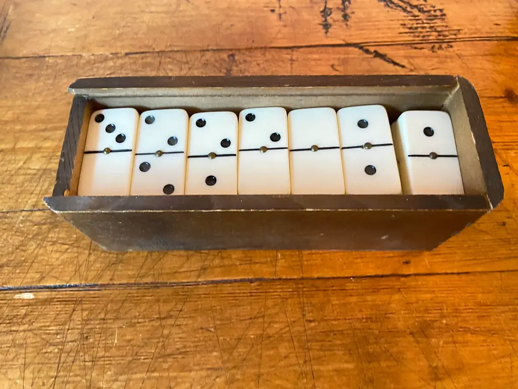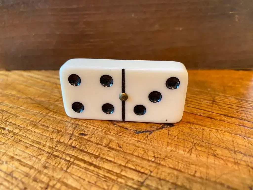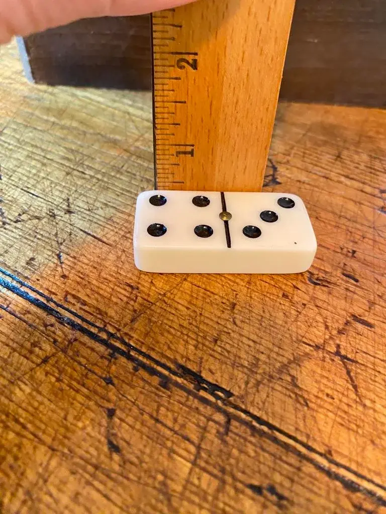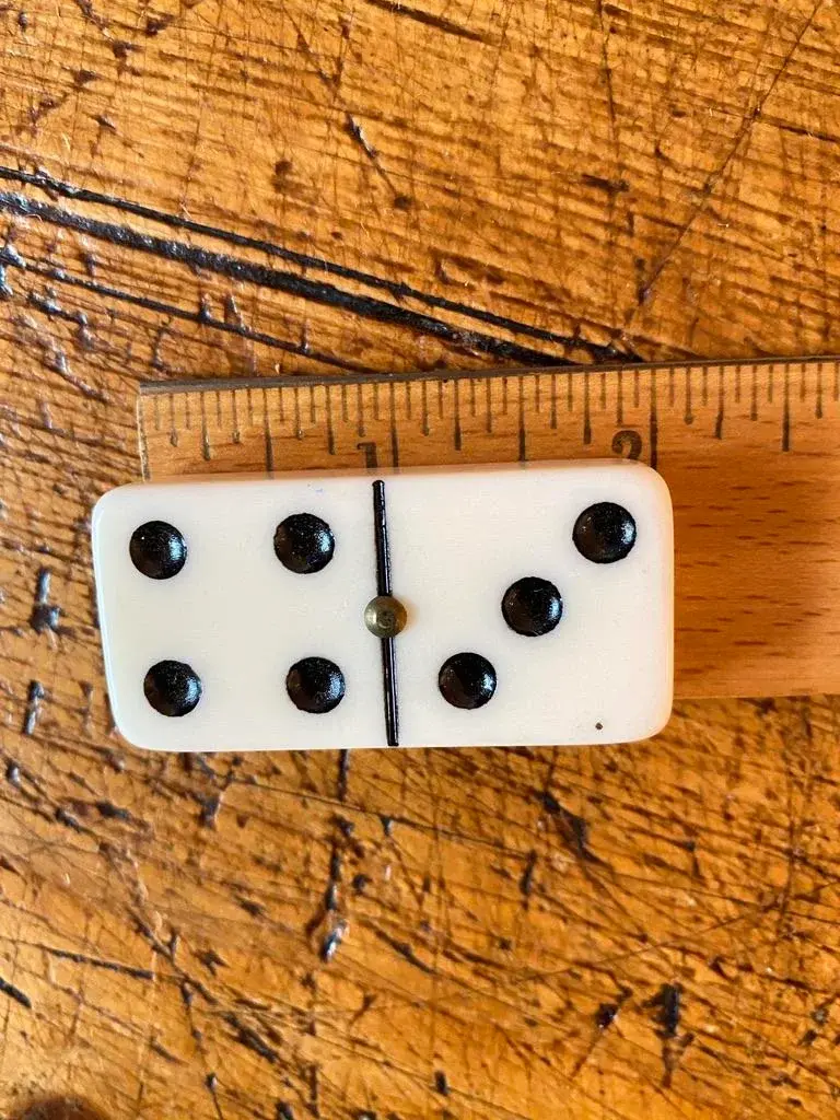 Vintage Bakelite Domino Set in original dovetailed wood box. 28-tile set, double six. The bakelite tiles are quite thick with rounded corners ~ just a smidge under 1/2". This set has a brass "spinners", aka pivots, which help to maneuver the pieces & protects them when being shuffled. Who knew. The tiles measure 2" x 1" x .4625" thick.