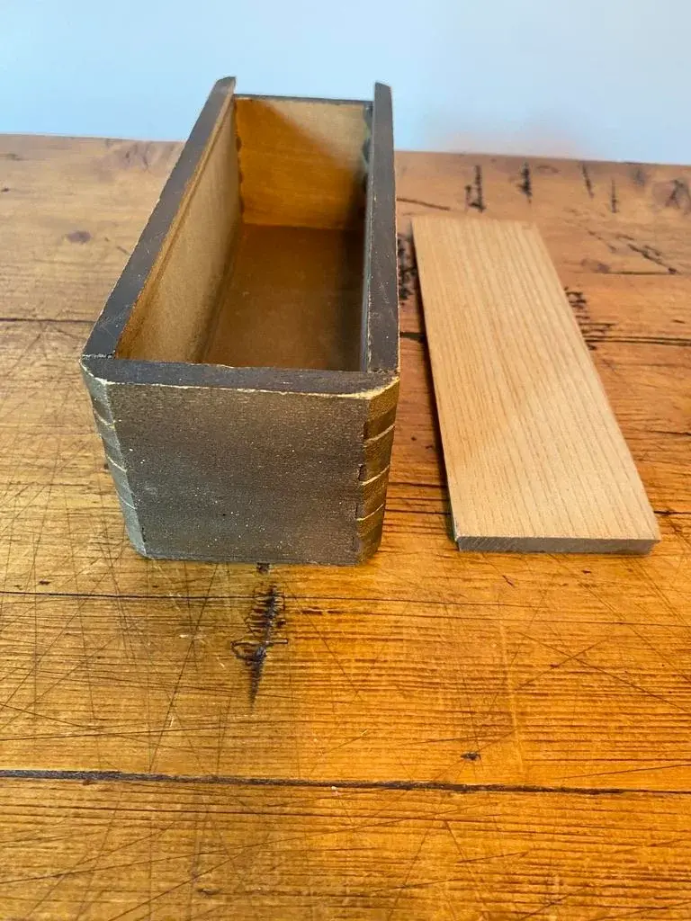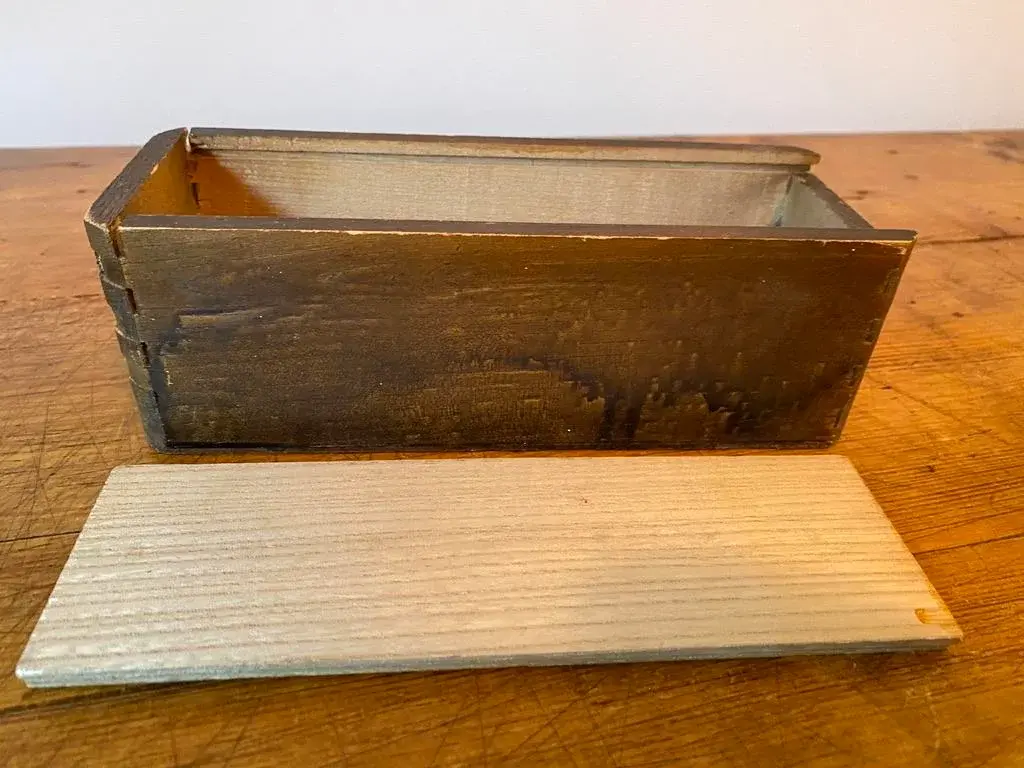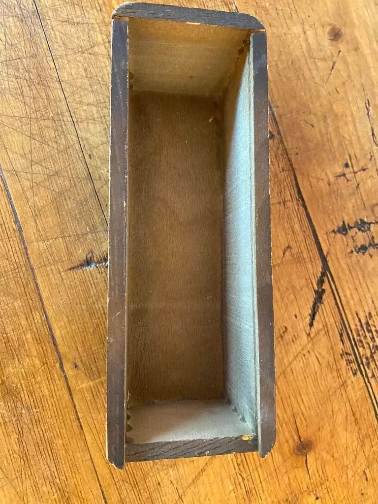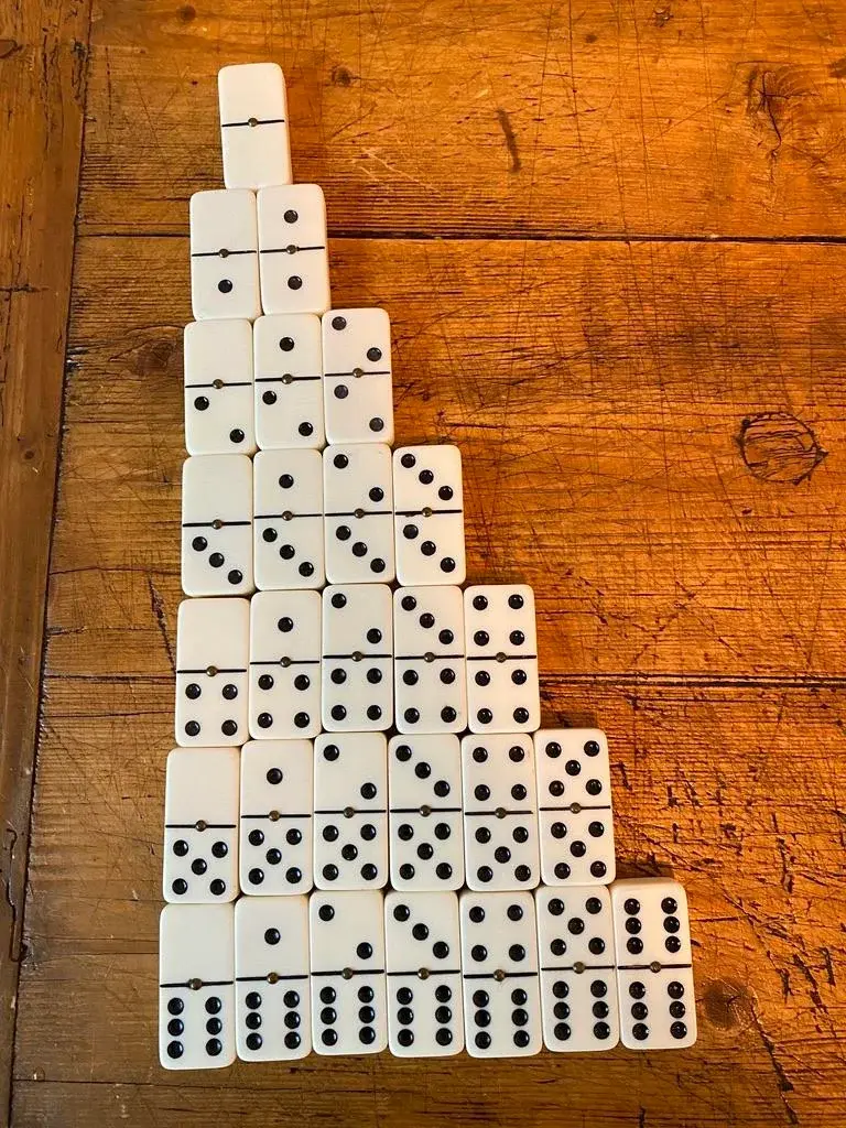Vintage Bakelite Domino Set in original dovetailed wood box. 28-tile set, double six. The bakelite tiles are quite thick with rounded corners ~ just a smidge under 1/2". This set has a brass "spinners", aka pivots, which help to maneuver the pieces & protects them when being shuffled. Who knew. The tiles measure 2" x 1" x .4625" thick.
