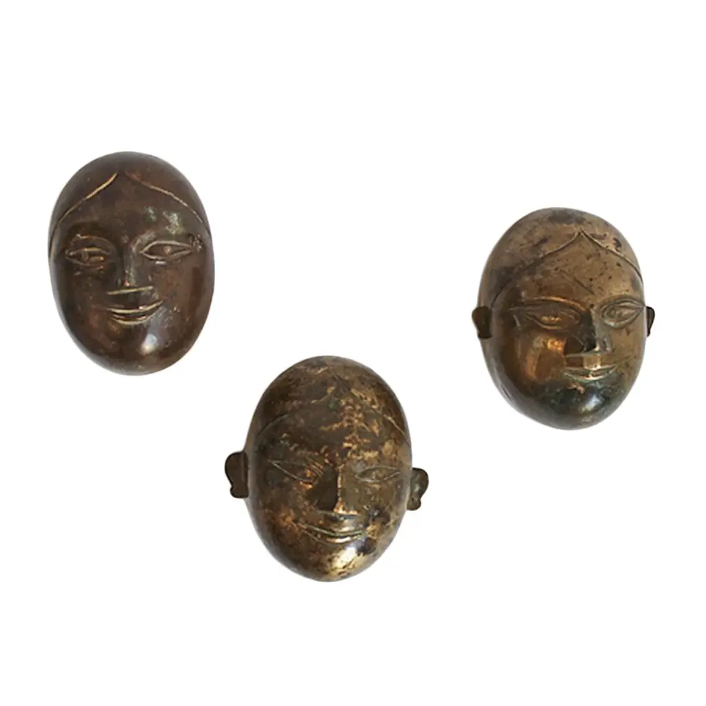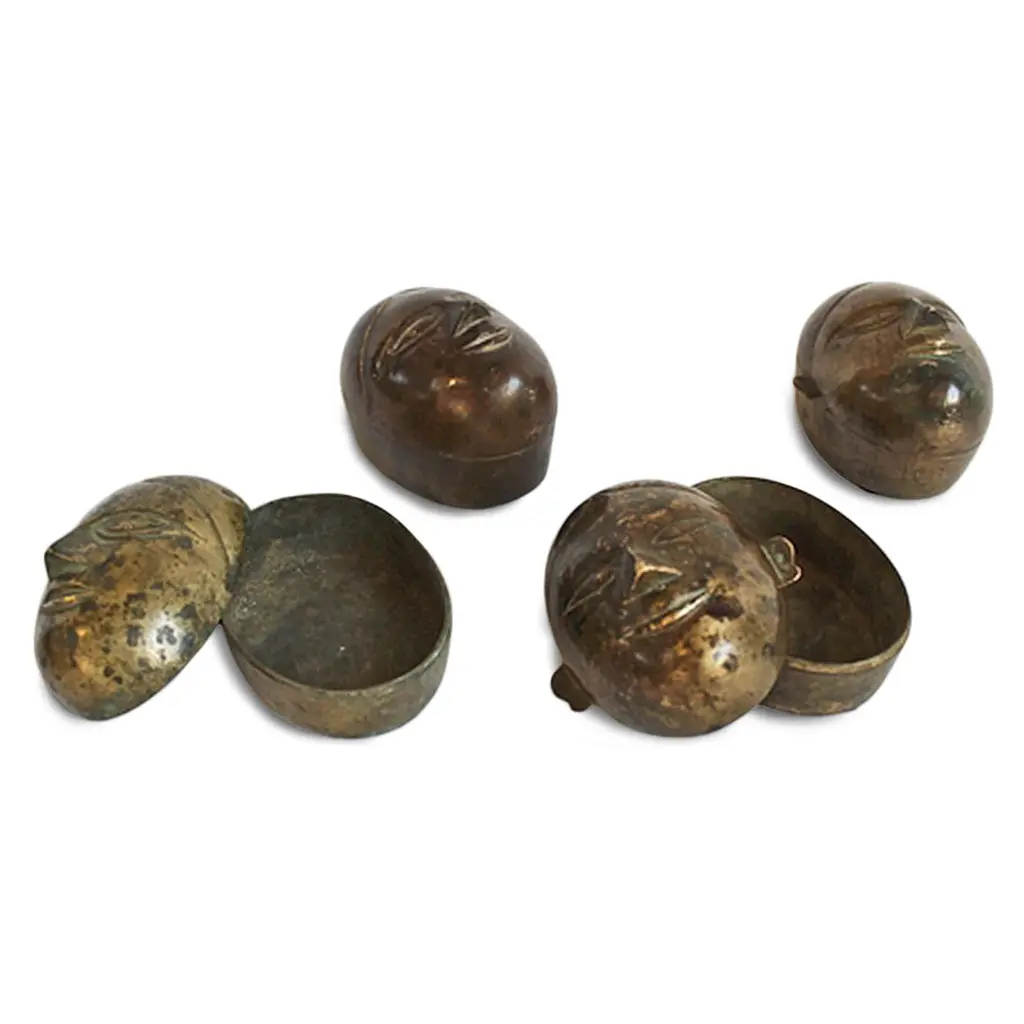 Unique 1940's antique brass Rada head Tikka / pill boxes from North India. Easy removable lids make these wonderful pieces for small storage and display. Perfect as a one of a kind gift for a loved one. Original aged patina. Each is unique and sold individually.