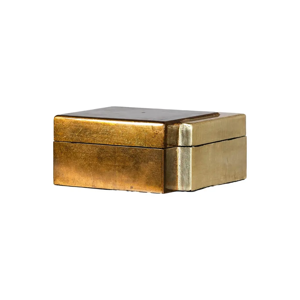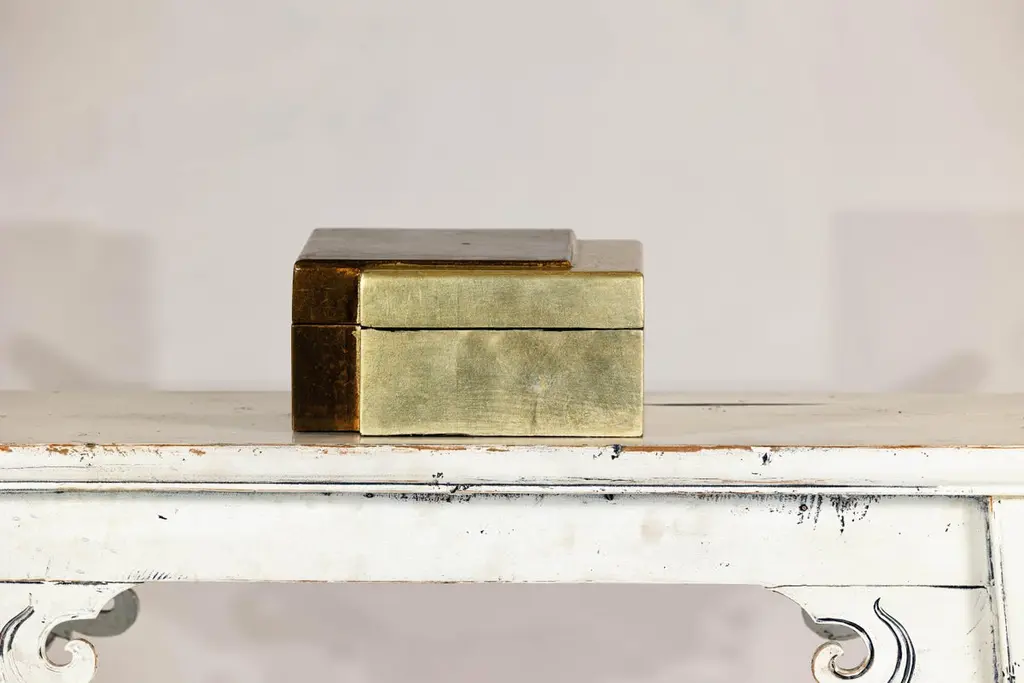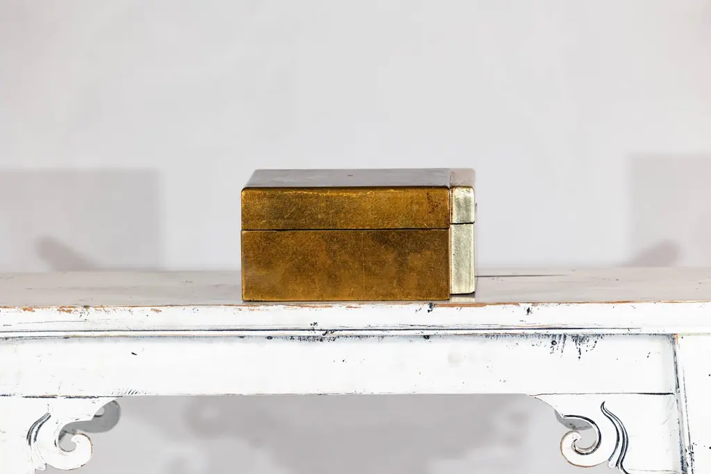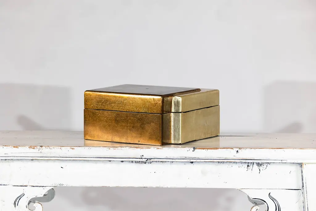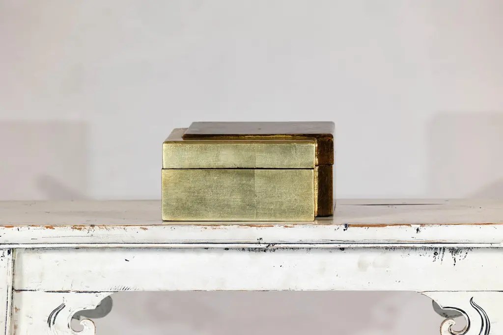 This striking vintage Chinese two-toned decorative box captures the artistry of traditional craftsmanship while offering a unique, geometric design. Cloaked in a rich gold finish with subtle patina, this wooden box exudes understated opulence. Its asymmetrical design adds an element of modernity to its classic aesthetic, seamlessly blending form and function. The two-toned gilded surface lends depth and character, making it a versatile accent piece for contemporary or traditional interiors alike.This box serves as an elegant storage solution for small treasures, such as jewelry or keepsakes, while doubling as a statement piece on a coffee table or console. Its compact size makes it ideal for layering with other decorative objects, like books or vases, to create a sophisticated vignette. Its golden hues effortlessly catch the light, adding warmth and texture to any room.Whether used in an entryway for stowing keys or as a striking accent on a shelf, this decorative box elevates everyday utility into an art form. Perfect for collectors and design enthusiasts, it bridges the gap between vintage charm and modern elegance, making it a timeless addition to your home.