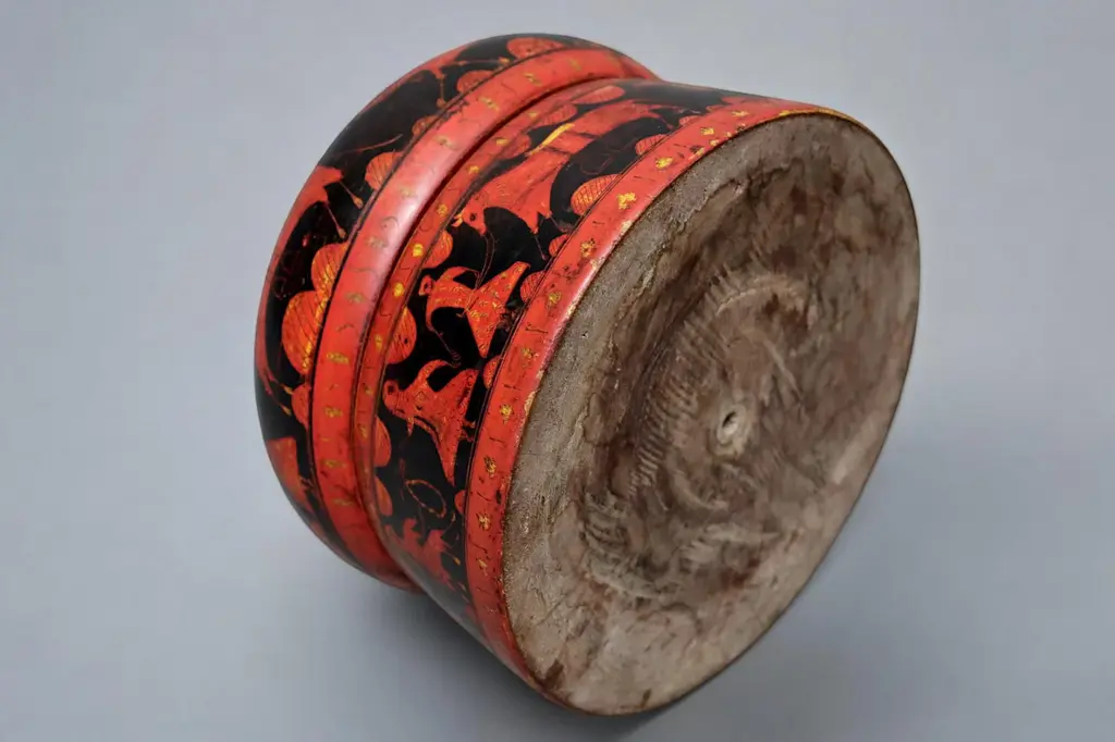 Antique handpainted stunning wooden lacquerware spice box from afghanistan / pakistan a handpainted wooden lacquerware spice box by afghan artisan. End c 1900 made of wood. it is a round shape container with domed lid and finial handle. The decorative handpainted designs are so intricate and so beautiful with different circle styles and patterns. Even with some paint color loss, it is in great condition considering the age of this spice container. it is antique and a really head turning piece, a beautiful addition to your collection *diameter of this box is: 18 cm (7 " inches) and height 18 cm (7" inches) inner diameter 6 cm and inner height 14 cm weight : 900 grams condition: restored *these box are very unique. There is no second bowl same as this one.