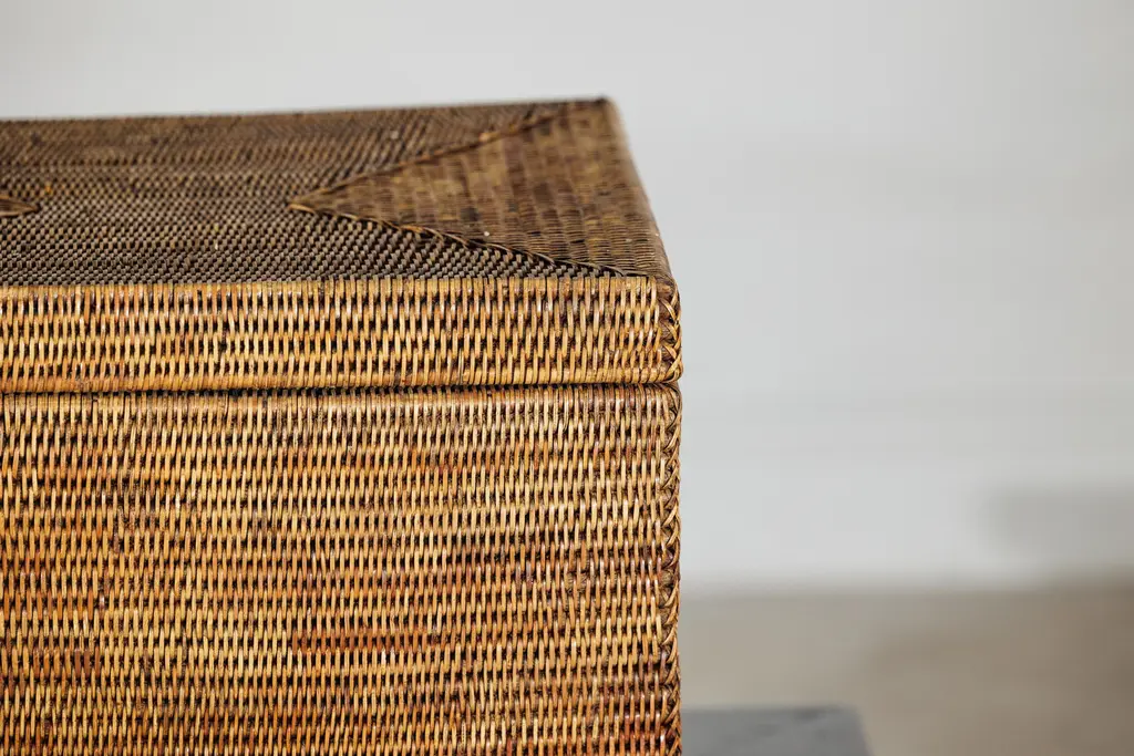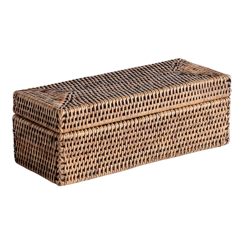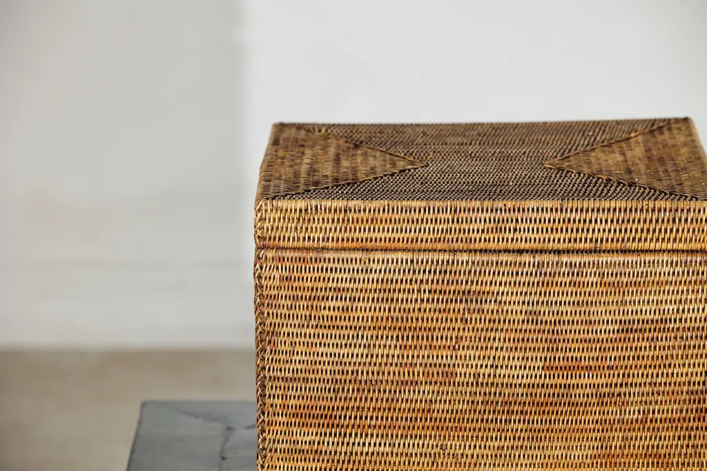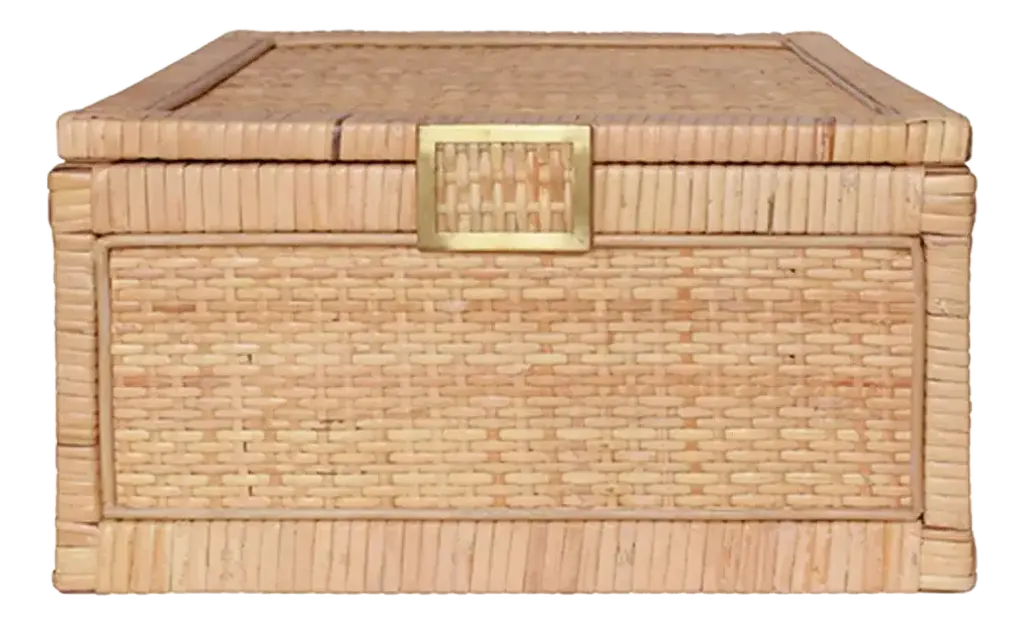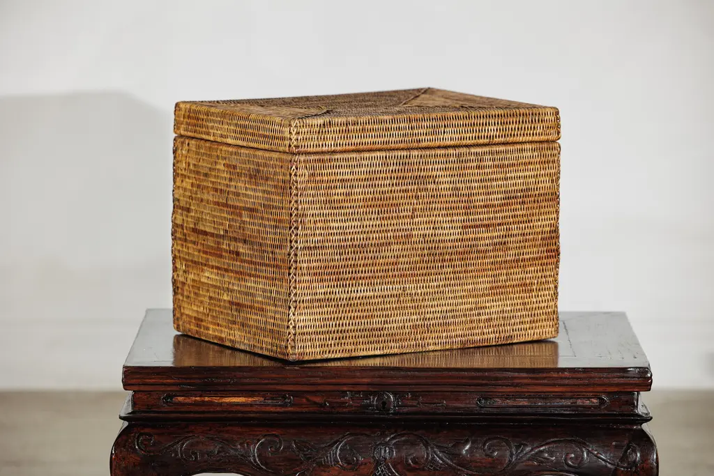 A vintage rectangular storage box crafted from finely woven rattan, featuring a removable lidded top. The tight, uniform weave creates a warm natural surface with subtle tonal variations ranging from honey to deeper brown, giving the piece depth and texture. The lid is reinforced with diagonal woven patterns at the corners, adding both strength and visual interest. Lightweight yet sturdy, this versatile box offers practical storage while serving as a decorative accent. It may be used to hold textiles, magazines, or personal items, and works equally well in living rooms, bedrooms, or entryways. The natural rattan finish lends itself to both casual and refined interiors, fitting seamlessly with coastal, rustic, or eclectic styles. Whether styled on the floor, atop a console, or placed on open shelving, this woven rattan box adds warmth and organic charm to any setting while remaining functional.