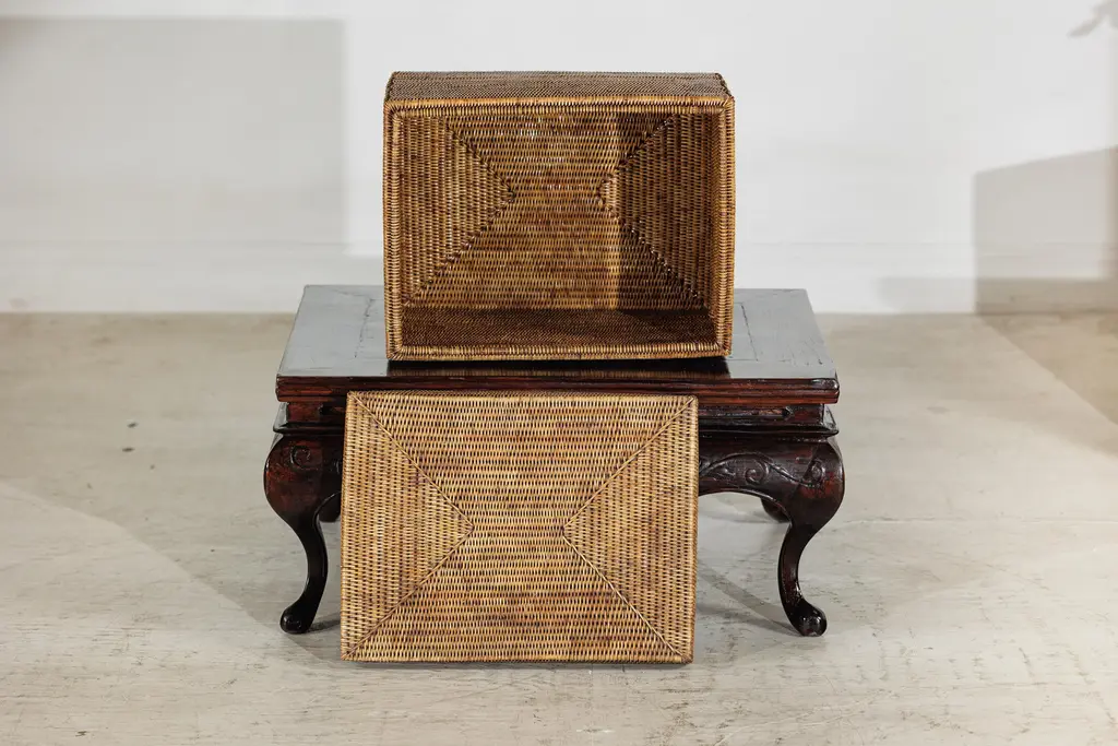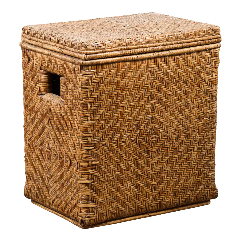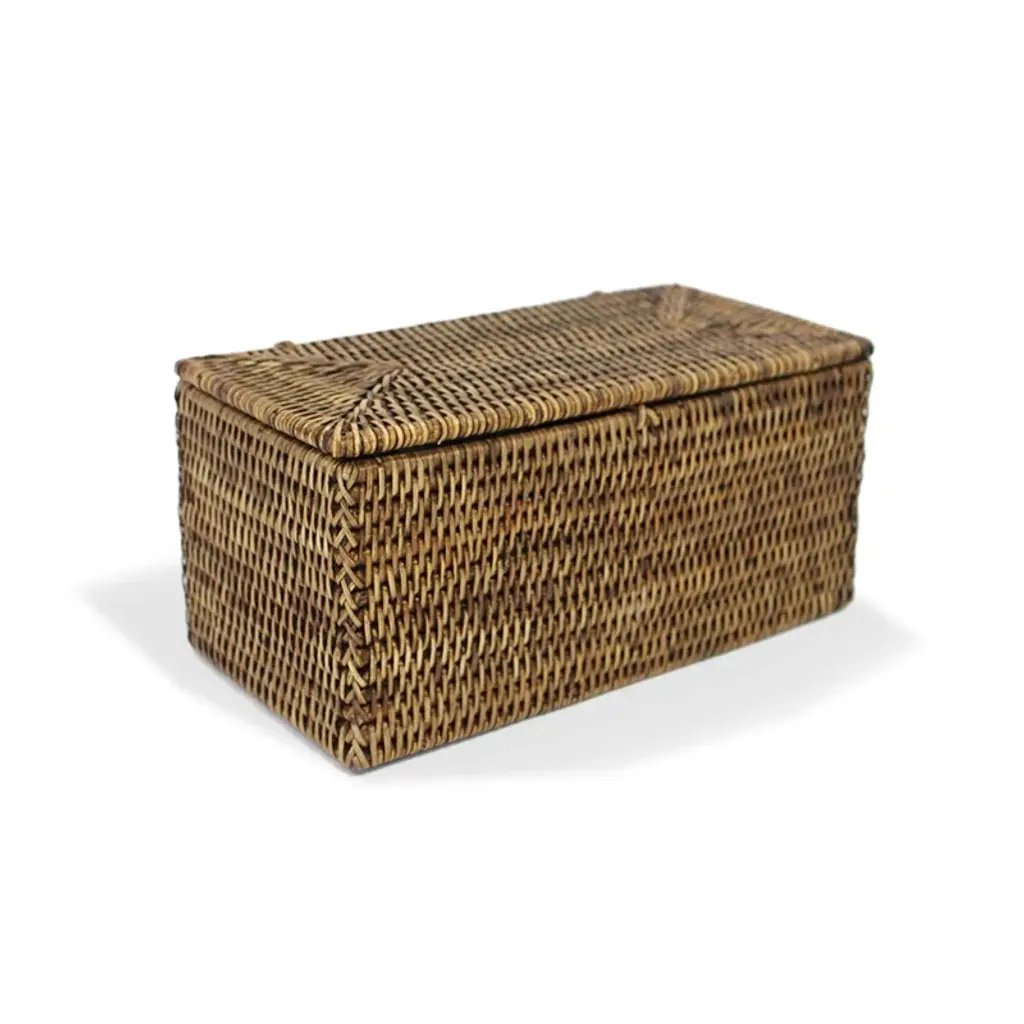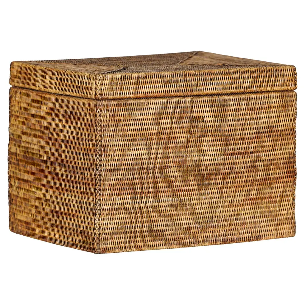 A vintage rectangular storage box crafted from finely woven rattan, featuring a removable lidded top. The tight, uniform weave creates a warm natural surface with subtle tonal variations ranging from honey to deeper brown, giving the piece depth and texture. The lid is reinforced with diagonal woven patterns at the corners, adding both strength and visual interest. Lightweight yet sturdy, this versatile box offers practical storage while serving as a decorative accent. It may be used to hold textiles, magazines, or personal items, and works equally well in living rooms, bedrooms, or entryways. The natural rattan finish lends itself to both casual and refined interiors, fitting seamlessly with coastal, rustic, or eclectic styles. Whether styled on the floor, atop a console, or placed on open shelving, this woven rattan box adds warmth and organic charm to any setting while remaining functional.