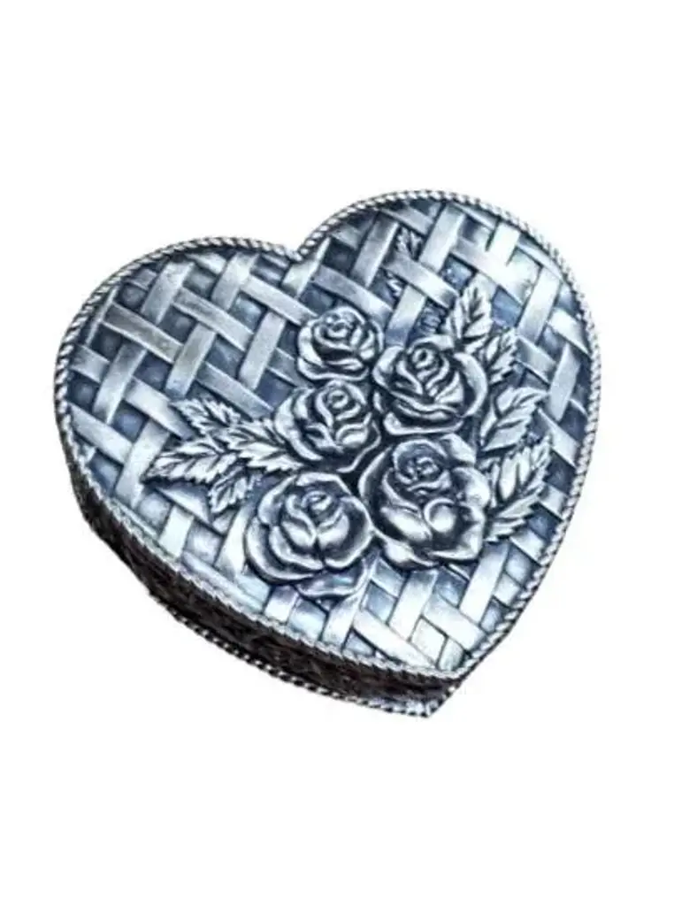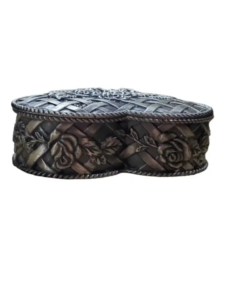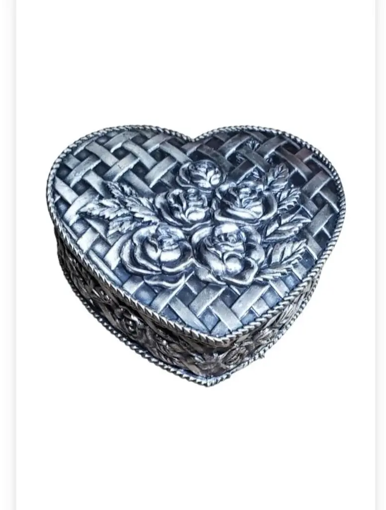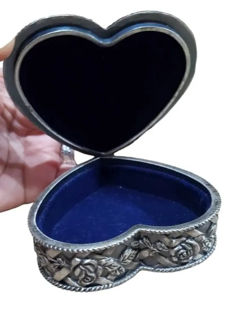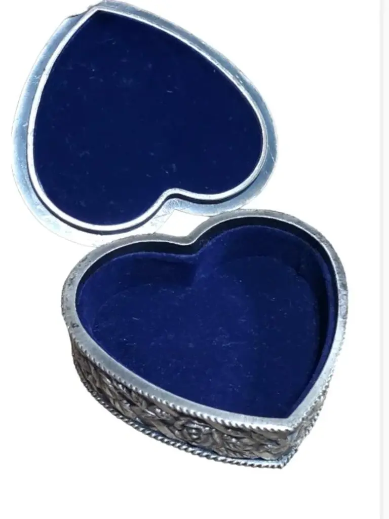 Vintage Pewter Heart-shaped Rose & Lattice raised design Trinket Box with Lid lined inside with soft Blue Velvet size 3.5 inches wide 1 ¼ inches tall with raised roses and lattice 8.5 0z weight @mnkfarm we are experienced shippers... We love our pre-loved vintage and want it to arrive safely to continue its journey with you! USA shipping rates posted. For international rates please message us first to update rates to ship international. Ty! Follow @mnkfarm to see more vintage items!