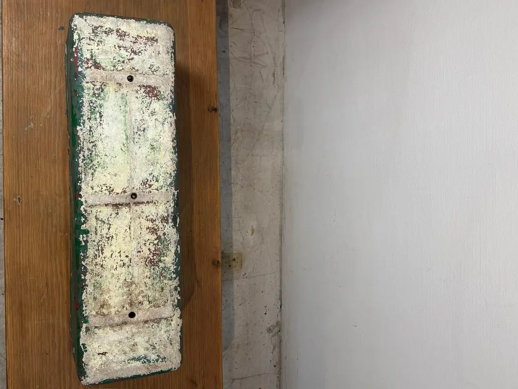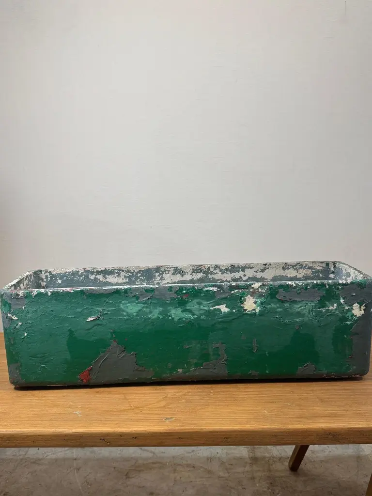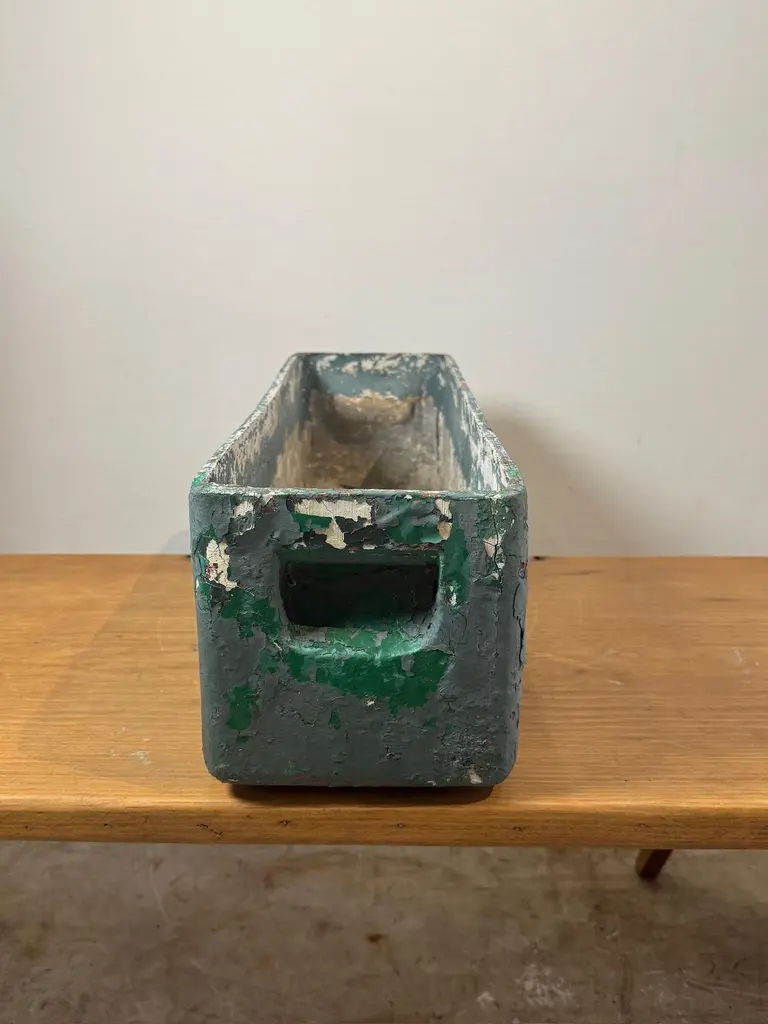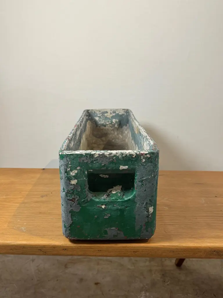 A rare and highly collectible vintage industrial planter box designed by Willy Guhl. This long rectangular planter features a heavily distressed green and white painted surface with a beautifully aged patina. Designed for durability and function, this planter embodies Guhl’s minimalist and functional aesthetic. Equipped with integrated side handles, it is perfect for use as a statement planter, storage container, or decorative element in any space.Constructed from heavy-duty metal, this planter is built to withstand time and the elements, making it suitable for both indoor and outdoor use. The layers of chipped paint and weathered finish enhance its rustic appeal, adding character to any setting. Whether placed in a modern loft, industrial-style home, or garden, this planter is a perfect blend of design and utility.We have two of these that match, if bought together, there will be a discount.