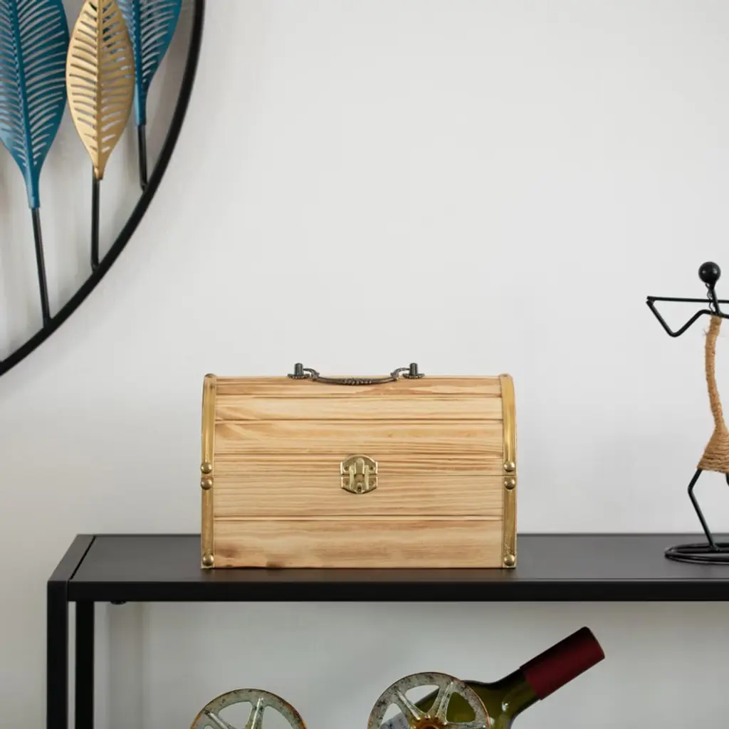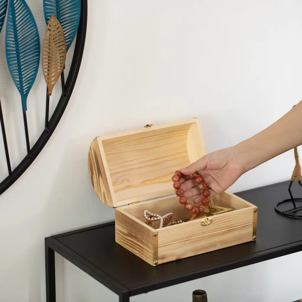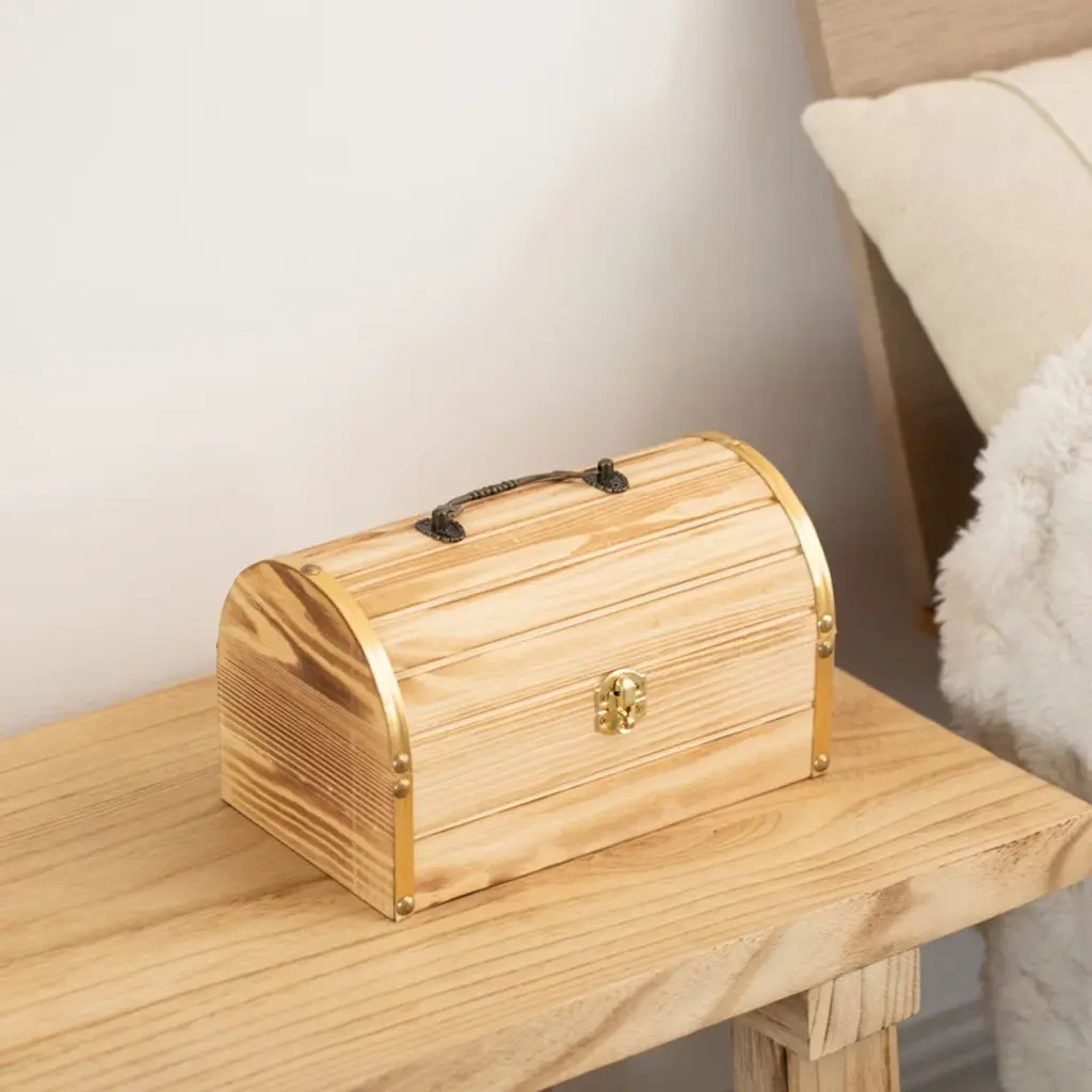 This wooden chest brings a sense of nostalgia and character to any space, blending classic design elements with a handcrafted appearance. The gently curved lid and exposed wood grain suggest an old-world charm, while the simple, unfinished surface allows the natural texture to take center stage. It’s a piece that feels both timeless and inviting, making it a thoughtful accent for interiors with a vintage or rustic theme. Carefully designed to offer visual interest without overwhelming your decor, this small chest works beautifully as a standalone statement or as part of a larger vignette. Its modest proportions allow it to tuck neatly into corners, atop furniture, or among other collectibles, adding depth and texture to your arrangement. The combination of curved lines, metallic accents, and wooden construction makes it a compelling addition to both traditional and eclectic settings. More than just a decorative object, this chest invites storytelling and imagination. It can be used in photo shoots, event setups, or stage displays where a touch of history or fantasy is desired. Whether placed in a reading nook, on a mantel, or beside other vintage treasures, it lends an air of discovery and charm that sparks curiosity and admiration.