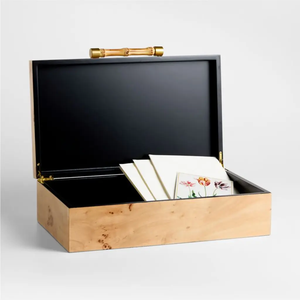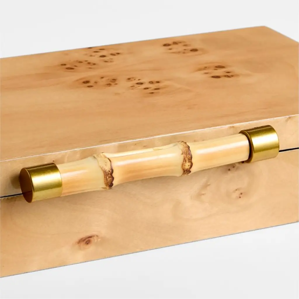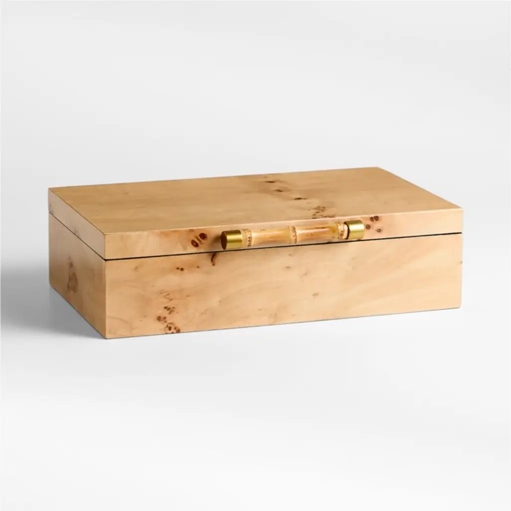 Our Volos storage collection corrals your miscellaneous must-haves, reducing clutter while showcasing the prized whorls of burl wood. Finished by hand to a high shine, this lidded box is adorned with a bamboo handle and gleaming brass hardware. We recommend using the large Volos box to hold and protect sunglasses on an entryway console, bracelets on a dresser or remotes on a coffee table.