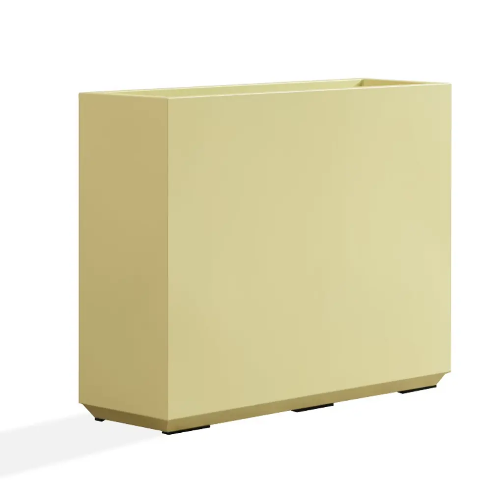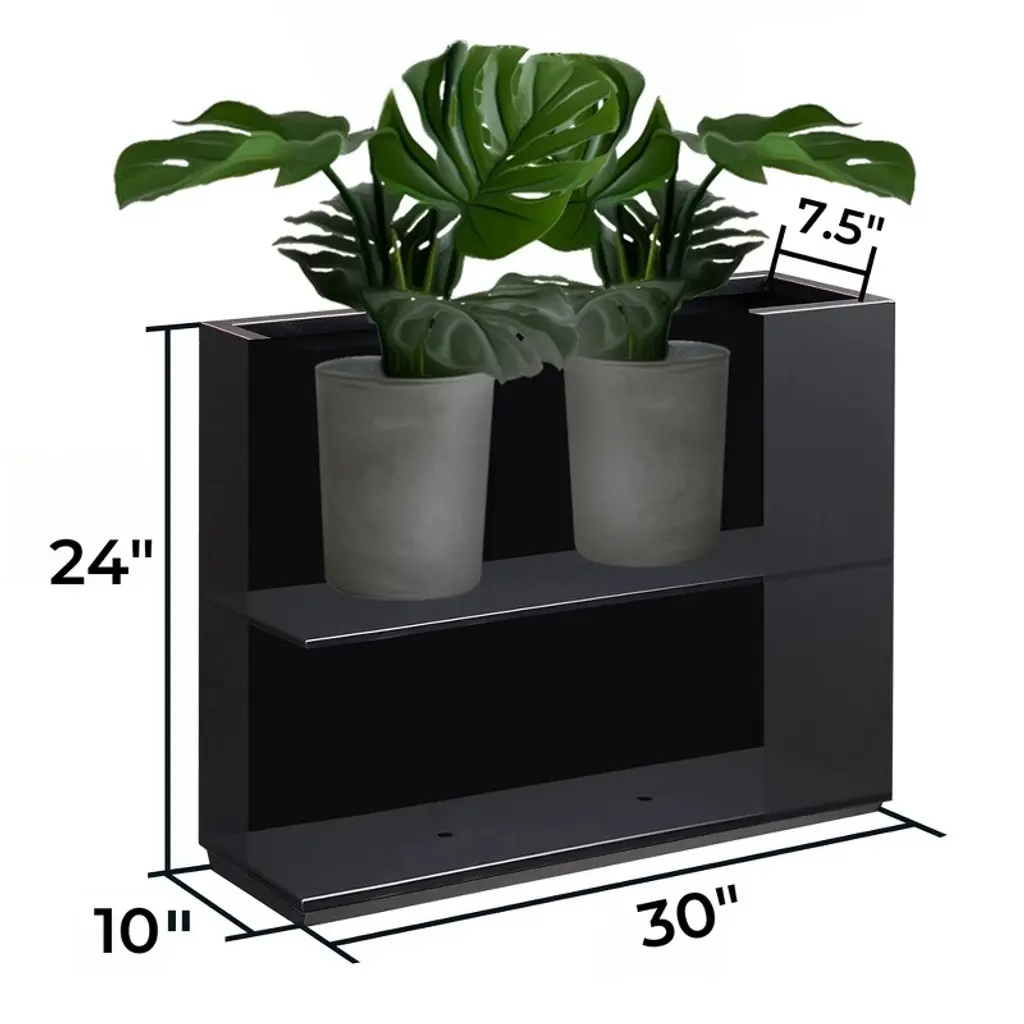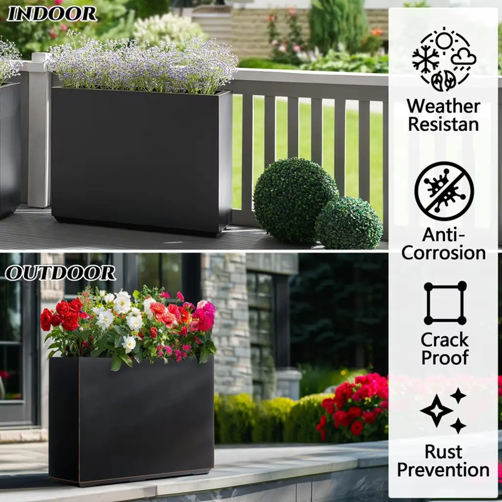 This elegant metallic planter box combines durability with style. Made from thick galvanized steel and coated with premium outdoor-grade paint, it features a black finish with a gold rim for a modern appeal. Perfect for outdoor spaces, it doubles as a privacy divider while offering practical features like a removable insert shelf and drainage holes to maintain healthy plant growth. Engineered for all weather conditions, this planter is built to last with salt spray resistance.