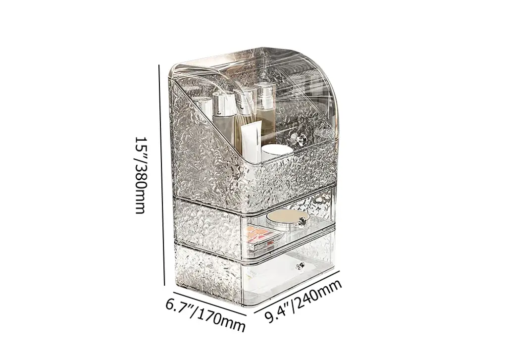 Experience efficient storage and effortless access to your beauty essentials with the Water Ripple Makeup Organizer. The two spacious drawers provide ample room to store your makeup brushes, palettes, lipsticks, and more, while the top dust cover keeps your cosmetics protected from dust and dirt. Say goodbye to cluttered countertops and hello to a beautifully organized makeup station.
