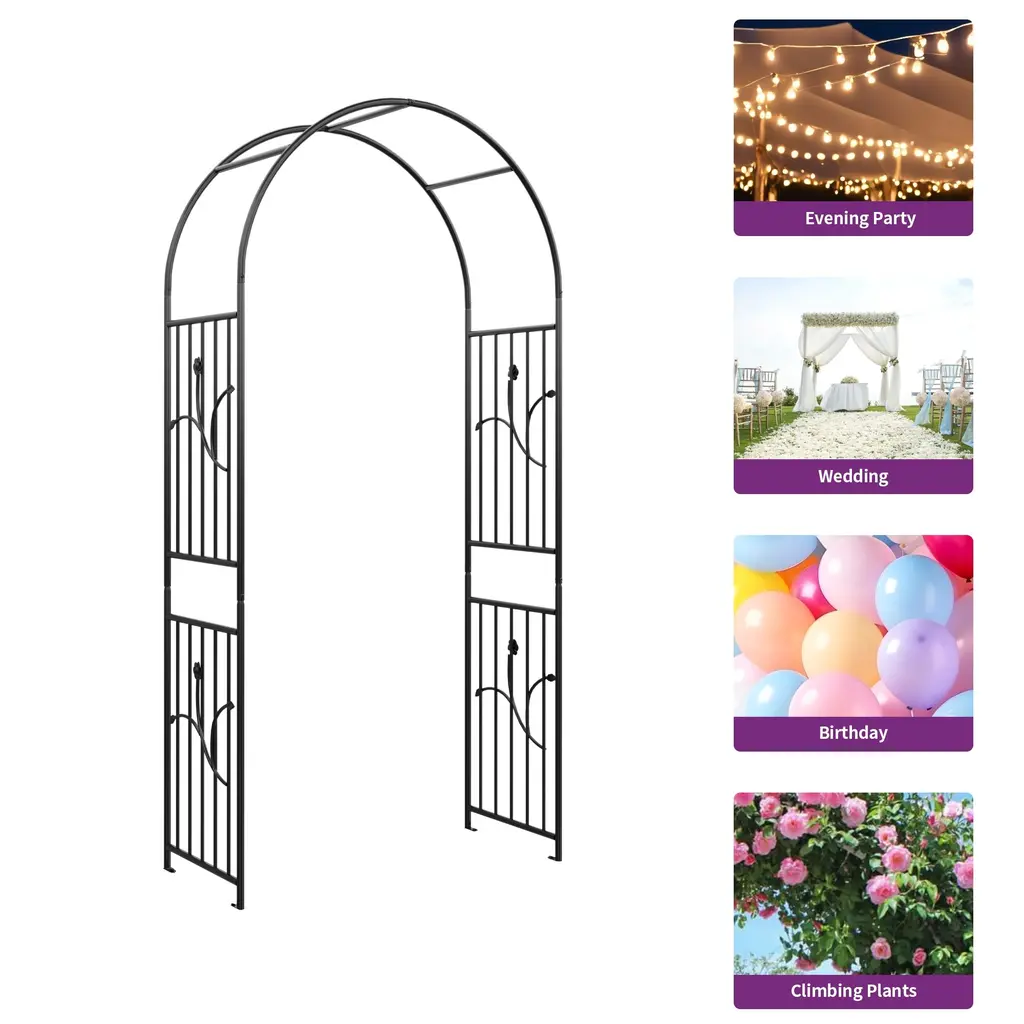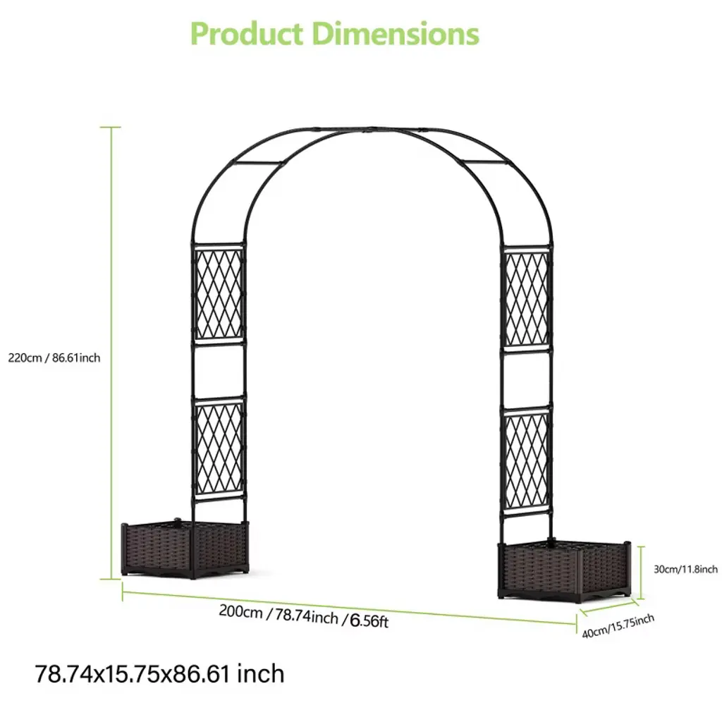 Wedding Arch Frame with 2 Planter Boxes, Weather-Resistant Metal Garden Arbor Trellis, Outdoor Decorative Archway for Climbing Plants, Weddings, and EventsKey FeaturesWeather-Resistant & Durable Construction – Built with a heavy-duty iron frame and PE weatherproof coating, this garden arch resists rust, deformation, and outdoor elements, ensuring long-lasting use.Elegant Decorative Archway – The graceful arch design pairs perfectly with flowers, climbing plants, string lights, wedding veils, or balloons, creating a stunning backdrop for gardens, patios, and events.Dual Planter Box Design – Equipped with two spacious planter boxes on each side, each featuring 4 drainage holes to promote healthy root growth and keep plants thriving.Multi-Functional for Any Occasion – Works as a garden trellis, decorative arbor, or wedding arch. Ideal for outdoor weddings, parties, festivals, or as a year-round garden feature.Easy Assembly – Comes with all necessary hardware and a detailed instruction manual, allowing quick and hassle-free setup.SpecificationsMaterial: PE + IronDimensions: 78.74x15.75x86.61 inch (L x W x H)Product Dimensions: 15.75"W x 86.61"HItem Weight: 22.6 lbsAssembly Required: YesPacking List1 x Metal Garden Arch with Planter Boxes1 x Instruction Manual1 x Assembly Kit