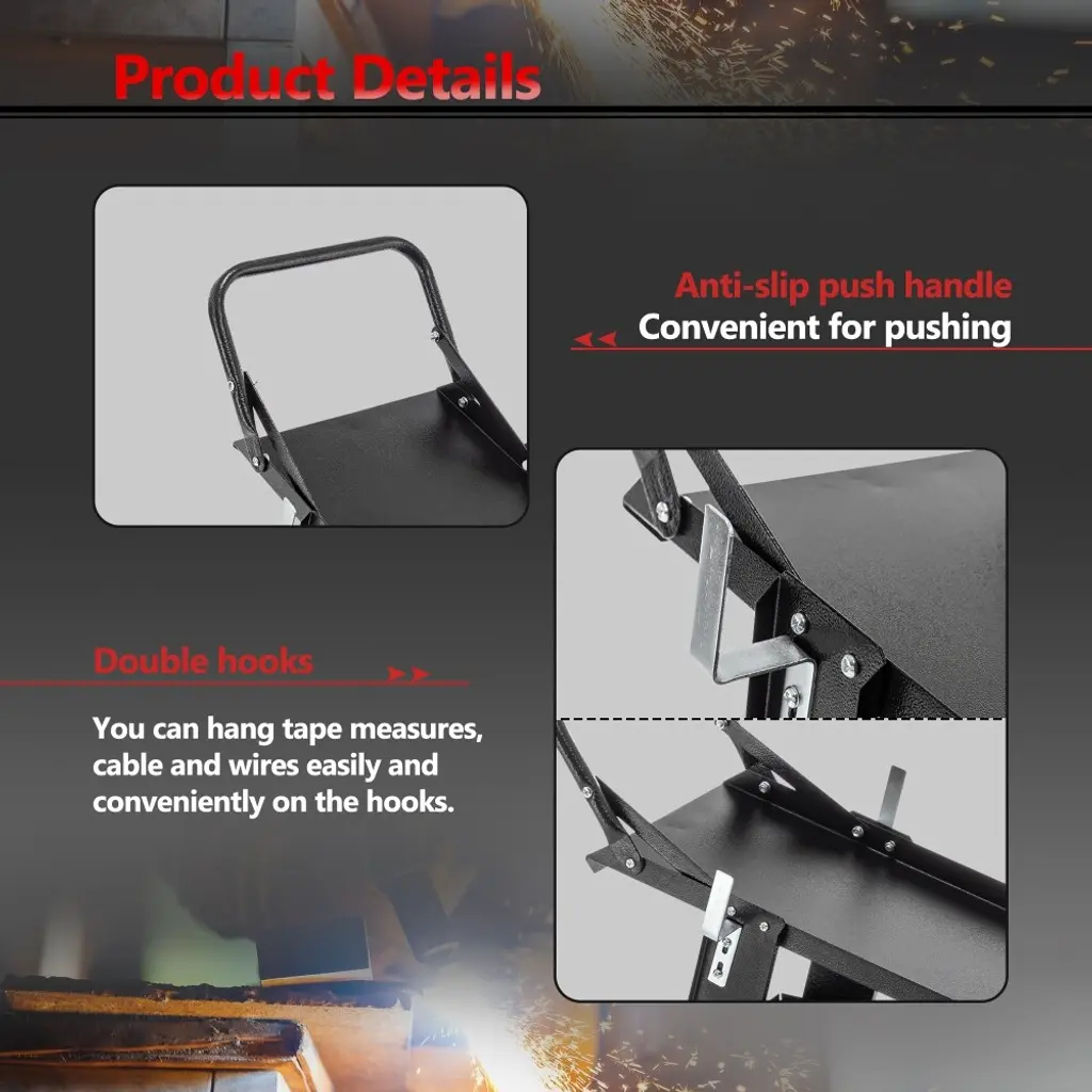 【Strong Weight Capacity】3-tier welding cart can effortless handle various heavy loads, with 400LBS maximum static weight capacity and 370LBS maximum dynamic weight capacity. Heavy-duty welder cart is suitable for a variety of welding tasks such as manual welding, gas shielded welding, and argon arc welding.【Premium Material】This welding cart is made of high-quality steel, which is durable and can be used reliably for a long time. The surface of the welding car is painted with black paint, which not only looks good, but also resists rust and corrosion.【3-layer Open Storage Space】This welding cart has 3 layers of open storage space, which provides a large space for placing welding tools, you can put the welding tools inside, which is convenient to carry. Sloping top shelf for easy access to welder controls, spacious rear shelf with 2 safety chains to secure gas cylinders【Welding Cart with 4 Wheels】This welding cart is equipped with 4 front and rear casters of different sizes, which move smoothly and turn the direction easily. The two front wheels can be rotated 360°, and the two large rear wheels provide optimum stability and are very labor-saving