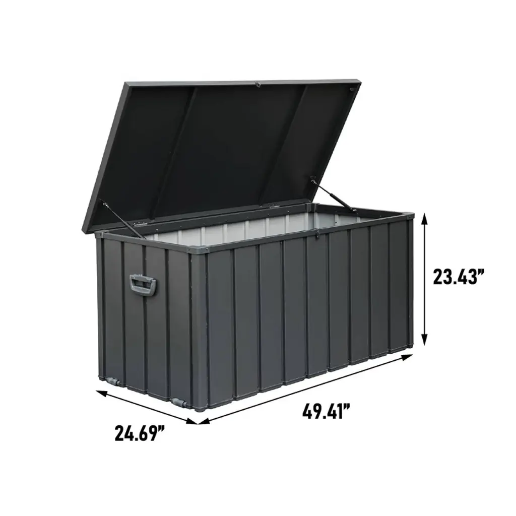 This versatile deck box offers a 100-gallon storage capacity and can support up to 440 lbs of static weight. Equipped with labor-saving pistons for extra support and strength, the box is designed with a slight slope to prevent water accumulation. Constructed with durable materials and galvanized steel reinforcement, it resists fading, rusting, and UV damage, making it ideal for storing various outdoor items and also usable as a patio table or stool.