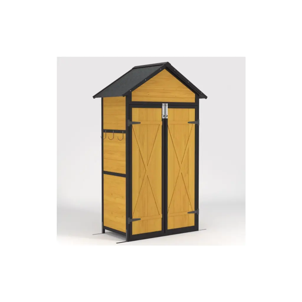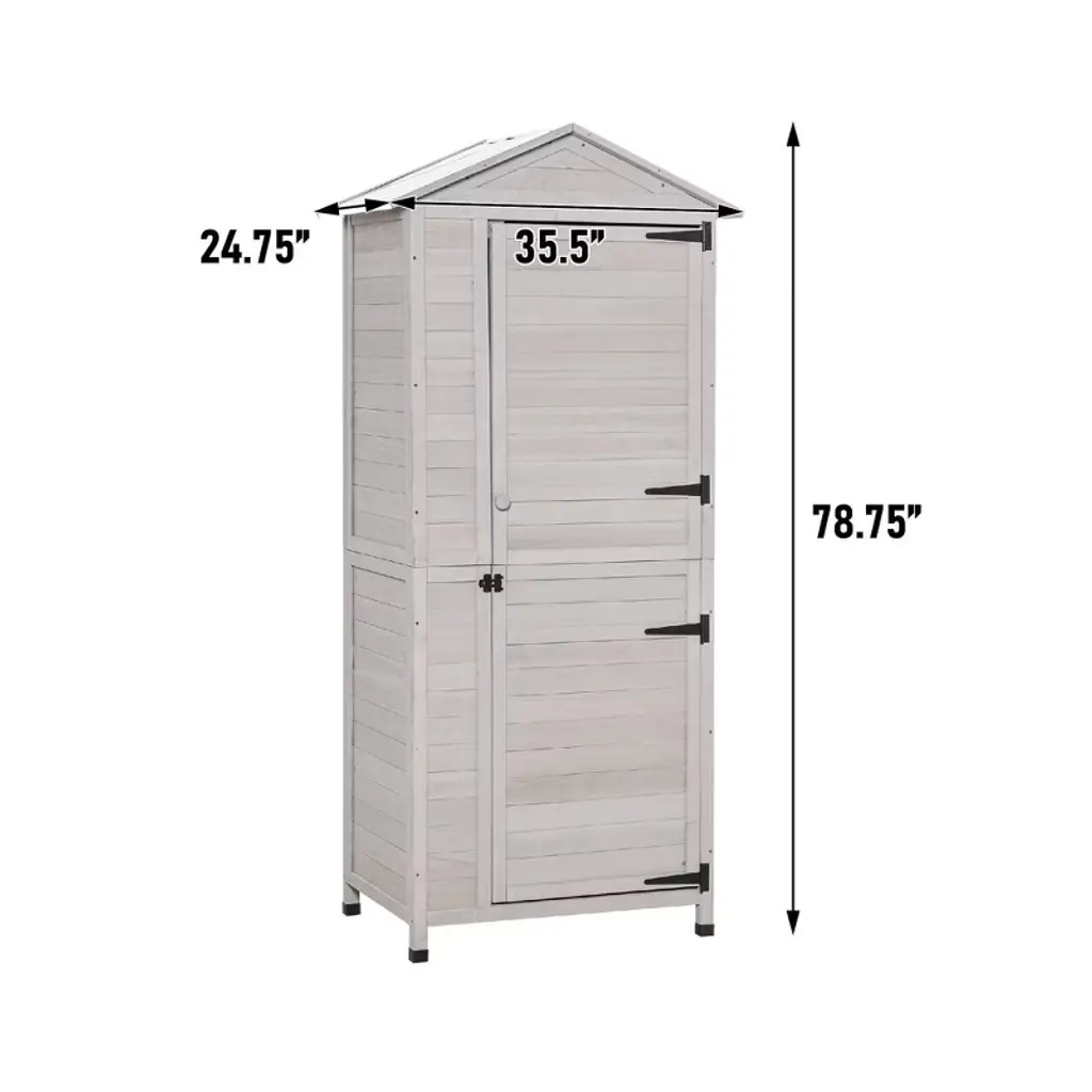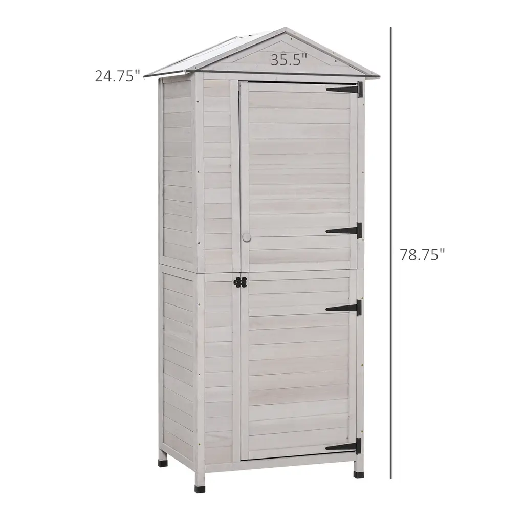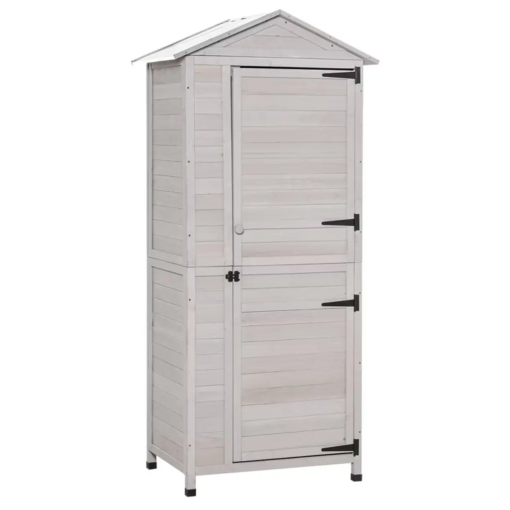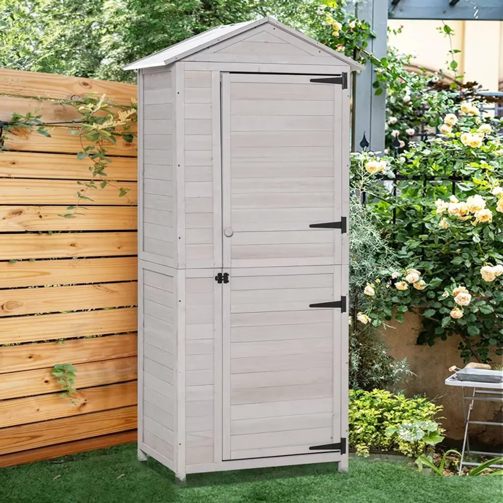 This outdoor storage cabinet is constructed from solid fir wood with exterior paint and an off-ground design, ensuring durability against harsh outdoor elements. It features a tilted tin roof for protection from wind and rain, and is divided into four shelves with three triangular boards for organizing gardening tools and outdoor equipment. The cabinet also includes a door with a round handle, lock, and magnetic latch for easy access and security.