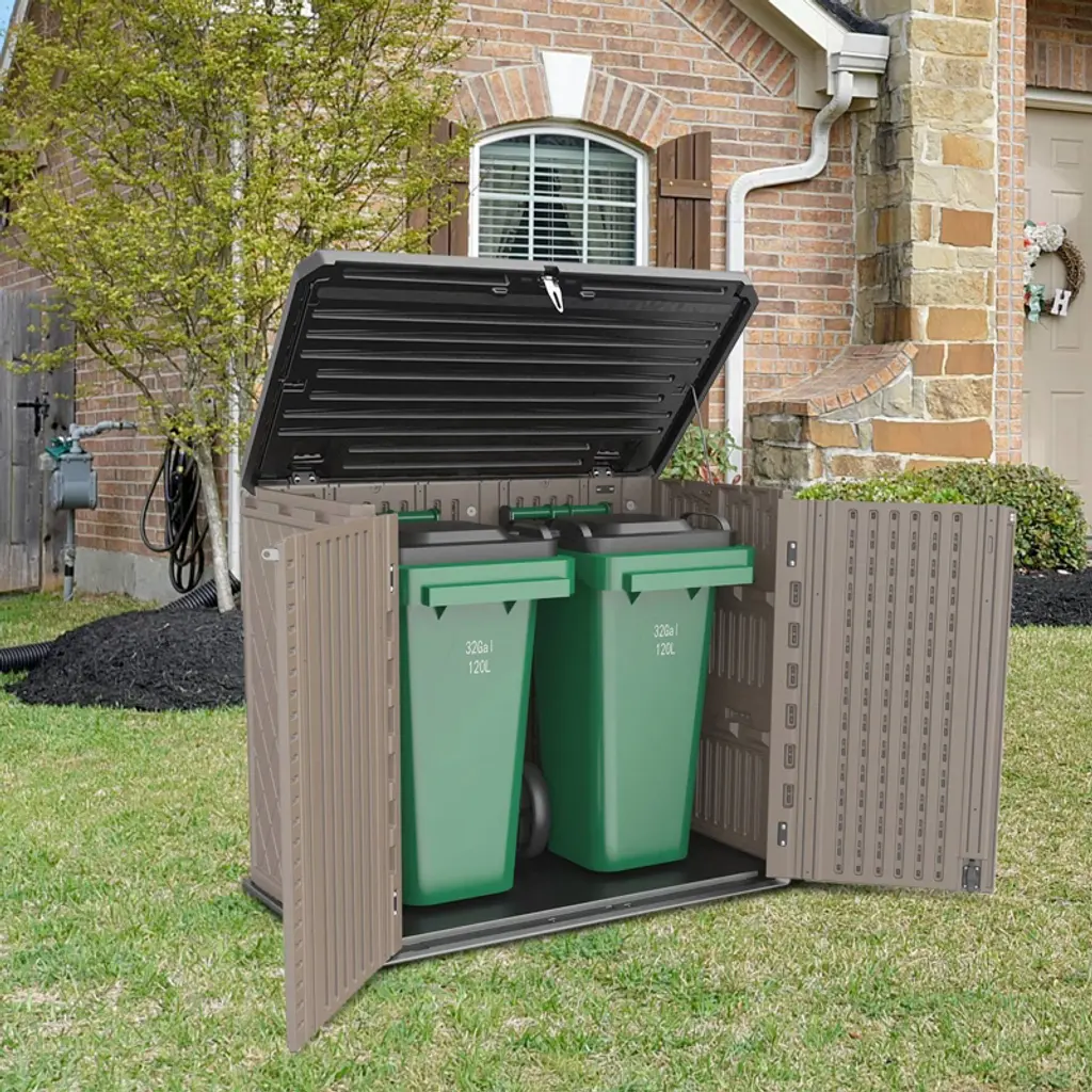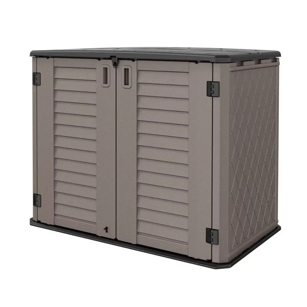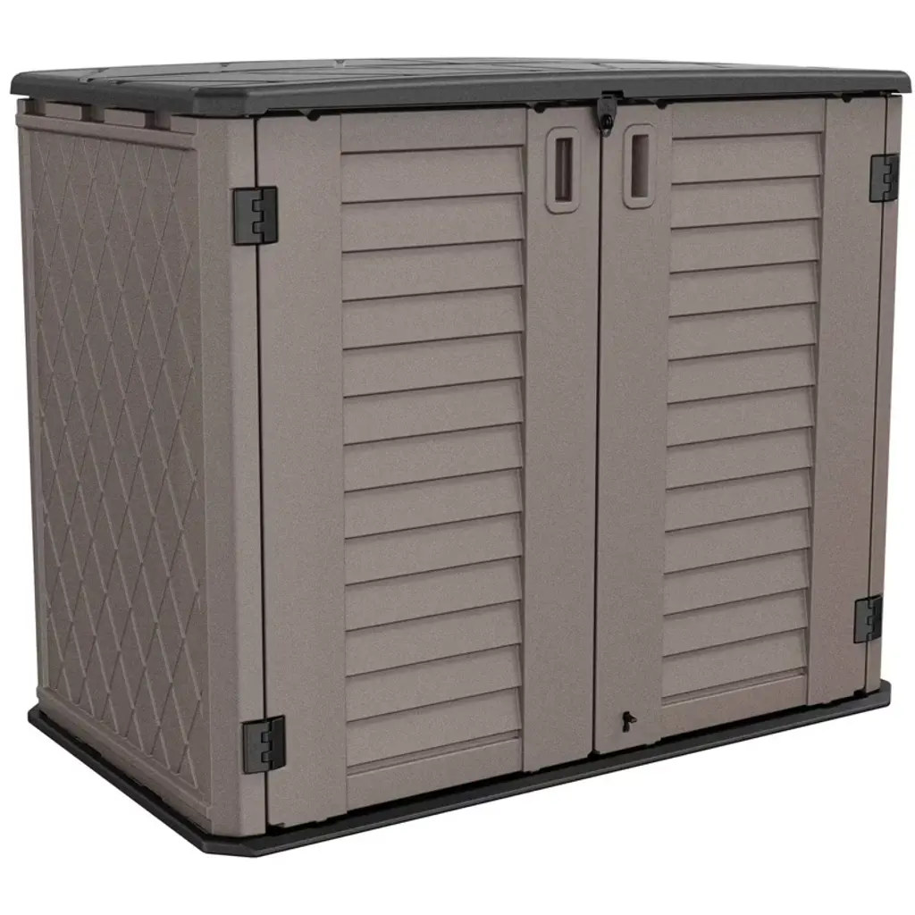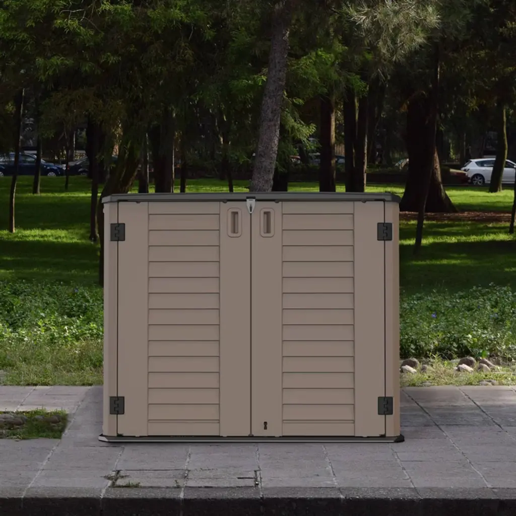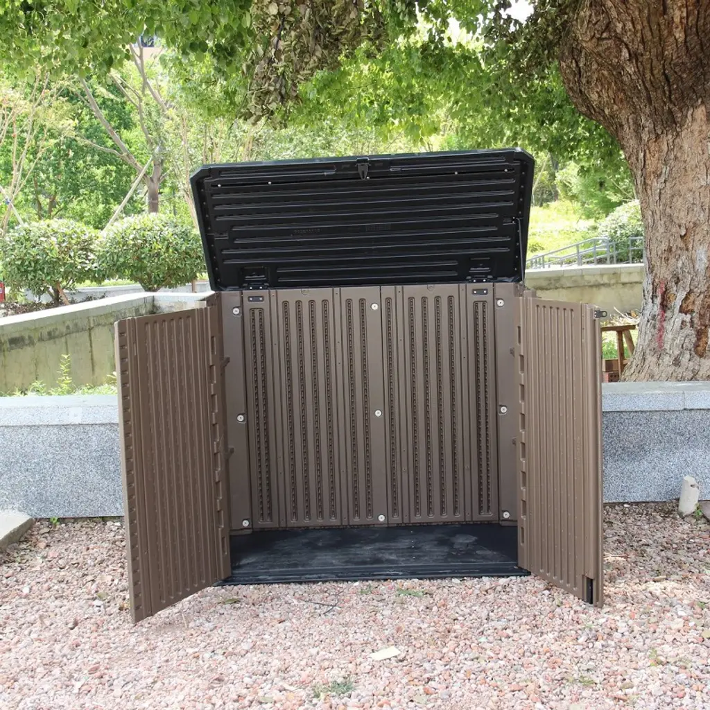 This storage shed is designed for easy anchoring to the ground and features a concave and convex roof to help rainwater flow off, preventing damage. It includes a dedicated location for laminate shelving (shelf not included) and is perfect for storing a variety of items such as garden tools, BBQ grills, firewood, and more. The lockable lid ensures added security for your stored items.