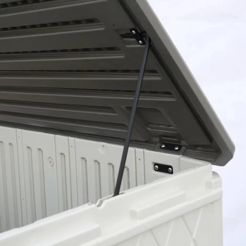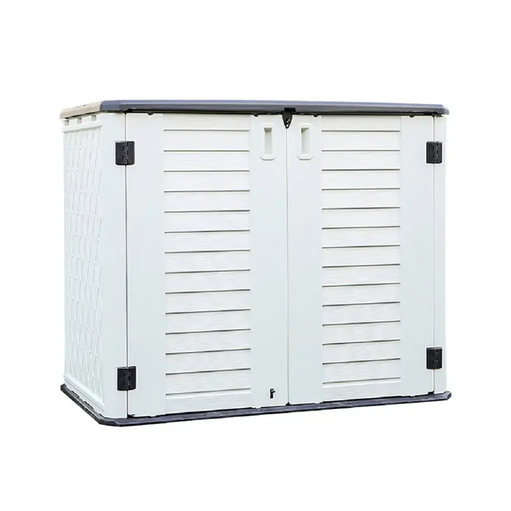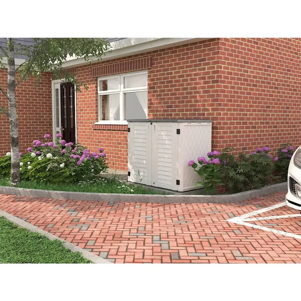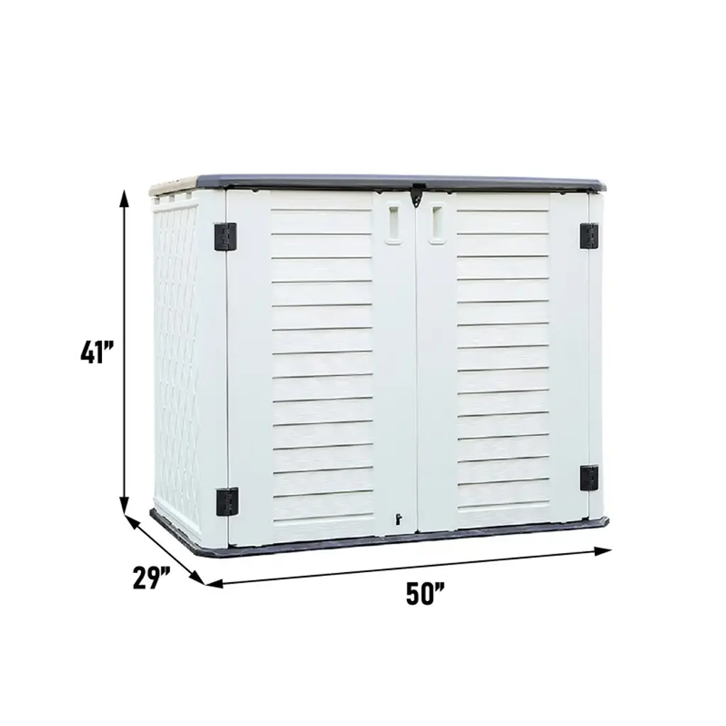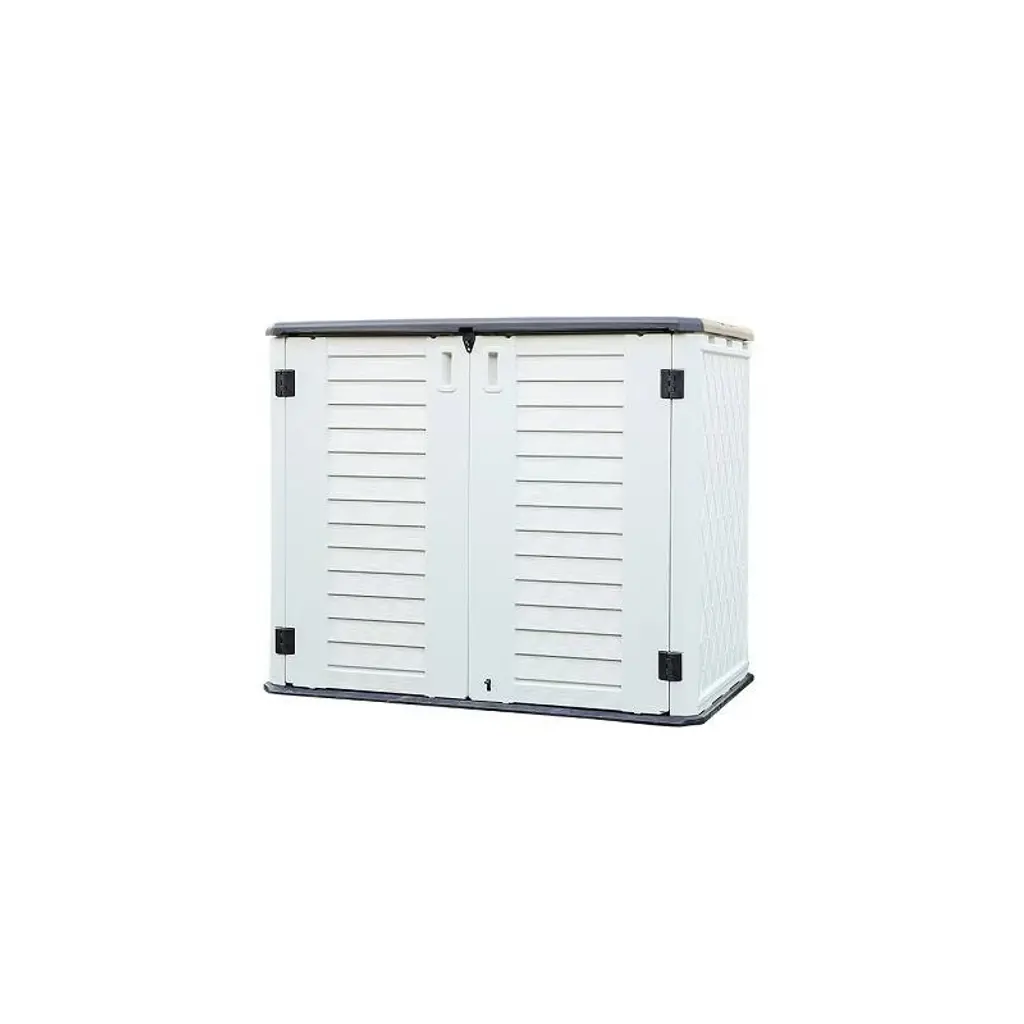 This storage shed is designed for easy anchoring to the ground and features a concave and convex roof to help rainwater flow off, preventing damage. It includes a dedicated location for laminate shelving (shelf not included) and is perfect for storing a variety of items such as garden tools, BBQ grills, firewood, and more. The lockable lid ensures added security for your stored items.