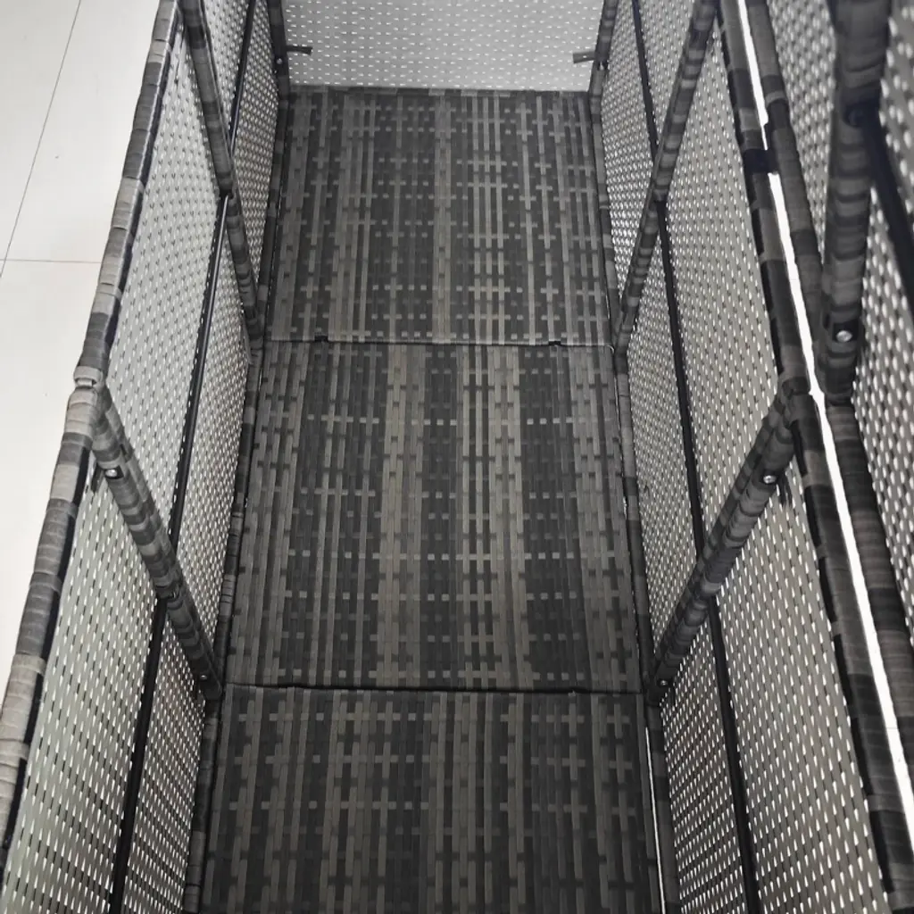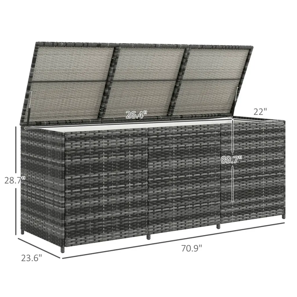 Stay organized and make the most of your outdoor space with the 175-Gallon Rattan Deck Box. This spacious storage container offers plenty of room for pool toys, garden tools, and other outdoor essentials. Crafted from hand-woven PE rattan, it features a galvanized steel frame, providing a stylish and durable exterior that is also weather-resistant.The protective polyester inner liner ensures your items stay clean and dry, adding an extra layer of protection from the elements. Thanks to the two pneumatic bars, you can easily open and safely close the lid without worrying about it slamming down, protecting both your belongings and your fingers.Dimensions:Overall: 70.9" L x 23.6" W x 28.7" HInner: 69.7" L x 22" W x 26.4" HWeight Capacity: 110 lbs