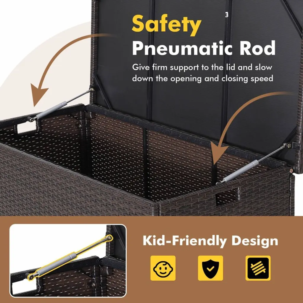 The Multi-Purpose Outdoor Storage Box combines functionality and style. With its spacious 50-gallon capacity, it offers ample storage for cushions, toys, tools, and more. Featuring a waterproof zippered liner, your items are kept dry and safe. Crafted from heavy-duty steel and wrapped in durable PE rattan, this box is designed for long-term outdoor use.The pneumatic rods provide smooth, controlled lid operation, while universal wheels and side handles make it easy to move around. Ideal for backyards, poolside, or as a side table, this versatile storage solution is easy to assemble and maintain. Keep your space organized and stylish with this practical addition to your outdoor area.