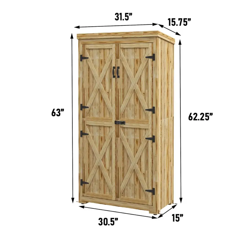 This outdoor storage cabinet is designed with three removable shelves, offering four distinct storage spaces for garden tools and supplies. Made from high-quality fir wood with a rustic polished exterior, it features a sloping asphalt roof to prevent water accumulation. The cabinet ensures stability with four metal brackets and six adjustable feet, making it a durable and space-saving solution for your garden storage needs.