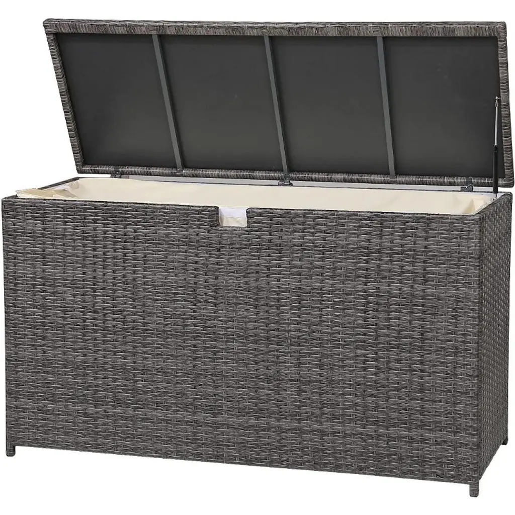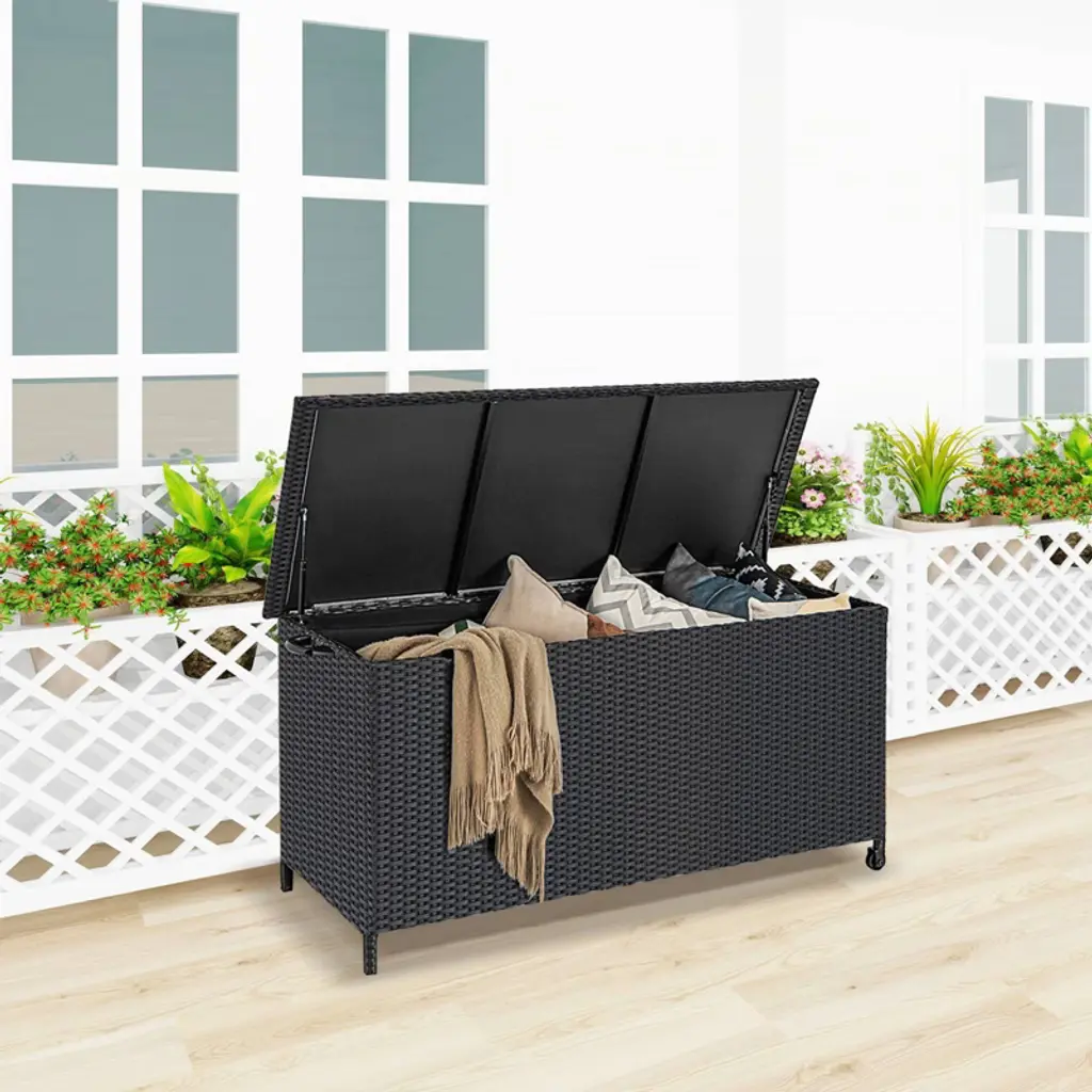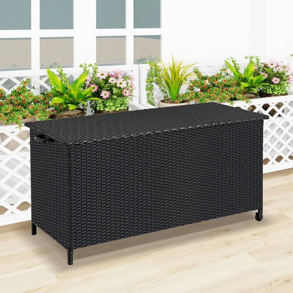The 85-Gallon Outdoor Storage Box is the ultimate solution for keeping your space organized. With its waterproof polyester liner and PP panels, this box ensures your items stay dry and protected. The premium PE rattan adds a stylish, sun-proof finish, while the metal frame provides sturdy support for long-lasting use.Equipped with universal wheels and a side handle, this box offers effortless mobility around your yard or patio. The gas strut makes opening and closing the lid a smooth and safe process, preventing sudden slams. Its versatile design also allows the box to double as a coffee table, seamlessly fitting into various indoor and outdoor spaces, from patios to living rooms.