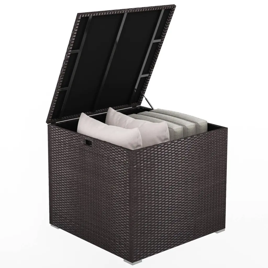 Keep your outdoor space organized and stylish with this Rattan Outdoor Storage Box. Featuring a spacious 72-gallon capacity, this multifunctional storage box provides ample room for cushions, garden tools, pool accessories, and more. The zippered polyester liner with PU coating offers extra protection for stored items, while the sturdy pneumatic rod ensures safe and smooth lid operation. Crafted with a heavy-duty metal frame, durable PP board, and hand-woven mix brown PE rattan, this storage box is built for long-lasting outdoor use.