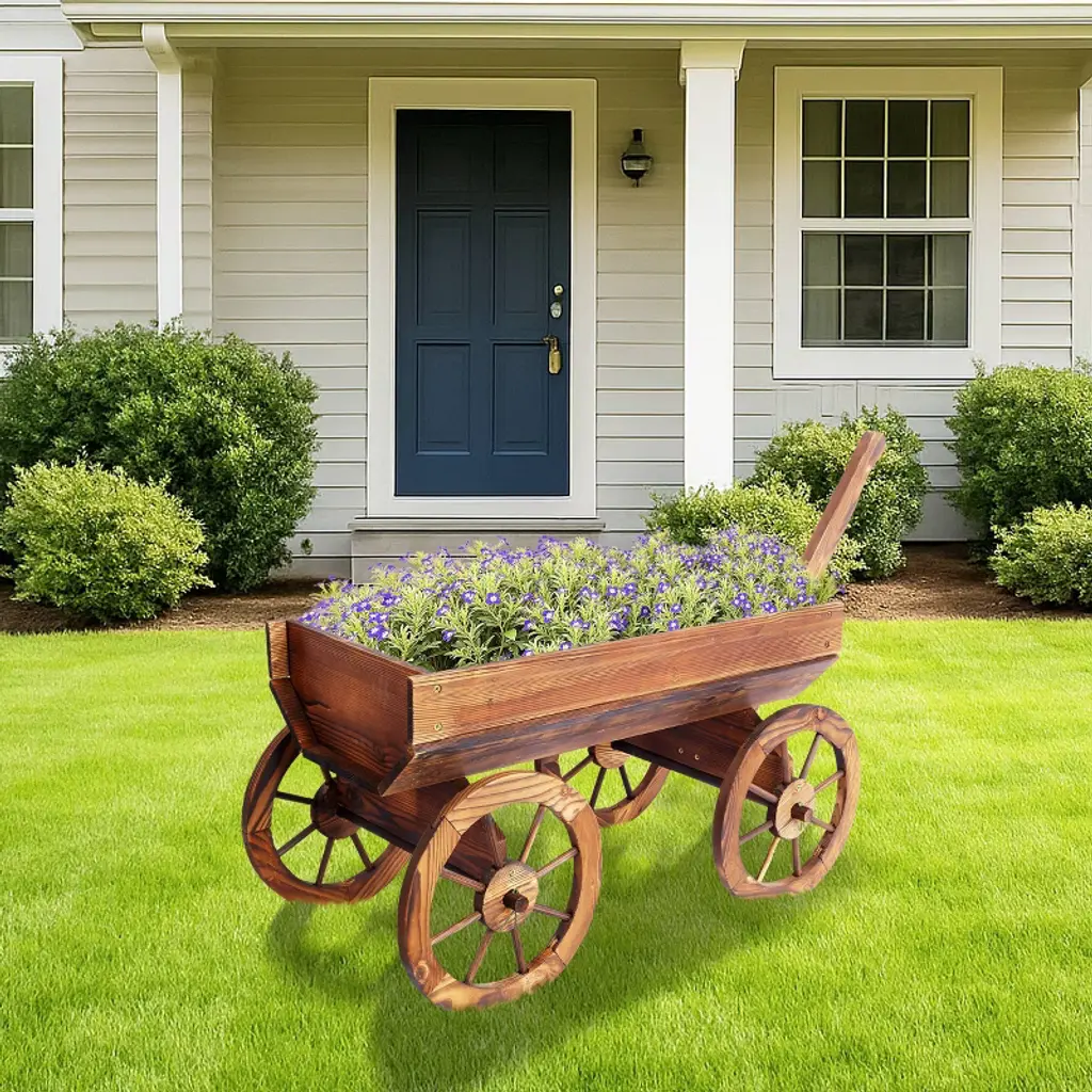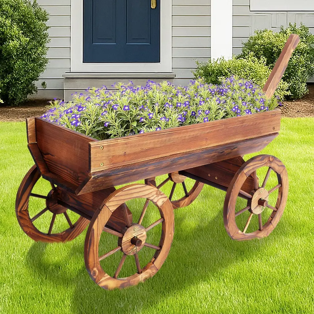 This charming wood wagon flower planter pot stand is crafted from durable solid fir wood with a burn finish, offering both resilience and rustic appeal. Its large barrel design provides ample space for plant growth, while the four wheels and long handle ensure easy mobility. Perfect for any garden or outdoor space, it promotes healthy plant growth while adding a stylish touch to your decor.